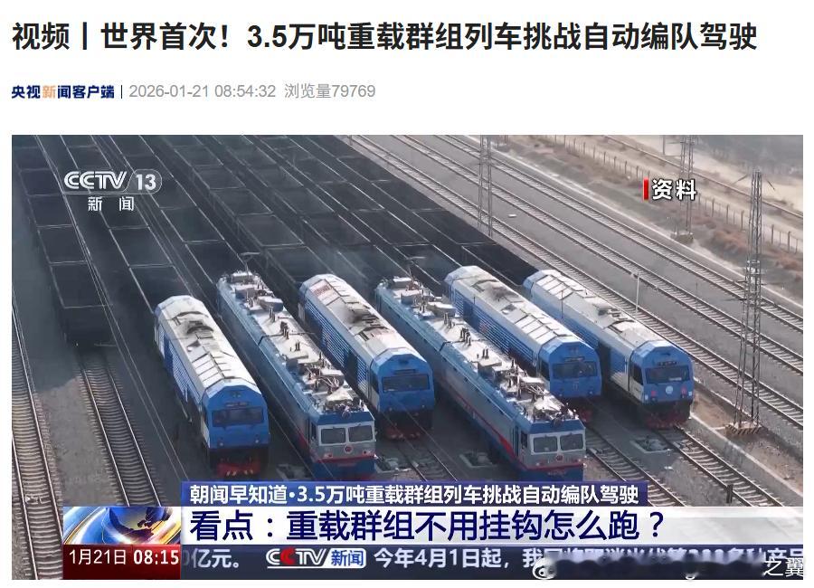 中国铁路再创世界纪录 1月21日上午,中国铁路在包神铁路成功完成了世界首次3.5万吨重载列车自动编队驾驶试验。这一突破不仅刷新了货运能力的上限,也标志着铁路货运控制模式的重大变革。试验由7列5000吨级货运列车组成,列车之间不再使用传统的机械钩锁进行物理连接,而是完全依靠无线信号实现协同作战,形成一个3.5万吨的超大“虚拟群组”。通过这种智能编队模式,在不新建铁路的前提下,现有线路的运力可以直接提升50%。系统采用了自主研发的智能控制系统,结合北斗厘米级定位和高带宽通信,确保7列列车能像一个整体一样同步加速、制动及运行,攻克了超长重载列车在动态编组、紧随追踪及自动解编中的技术难题。作为“西煤东运”重要通道的包神铁路(内蒙古包头至陕西神木),通过该技术的应用,将极大增强中国能源运输的保障能力。该项试验的成功验证了中国在重载铁路领域的全球领先地位,未来该技术有望推广至高铁及城市轨道交通领域。