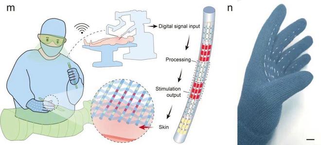 在虚拟现实领域,“纤维芯片”也能发挥重要作用。传统触觉交互手套依赖硬质传感器和芯片,难以紧密贴合皮肤,在远程手术等精细操作中存在局限。基于“纤维芯片”的智能触觉手套兼具全柔性与透气性,可集成高密度传感与刺激阵列,更精准模拟不同物体的力学触感。