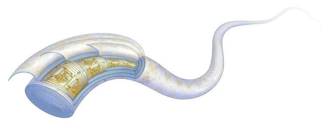 研究一度陷入僵局,直到一次灵感闪现。团队跳出“仅利用纤维表面”的惯性思维,提出多层旋叠架构的设计思路,即在纤维内部构建多层集成电路,形成螺旋式旋叠结构,从而最大化地利用纤维内部空间。“我们借鉴‘卷寿司’的方法,先在弹性高分子表面完成高精度微纳加工,再把它‘卷’成纤维形态,形成多层旋叠架构。”论文共同一作、先进材料实验室博士研究生王臻形容道。