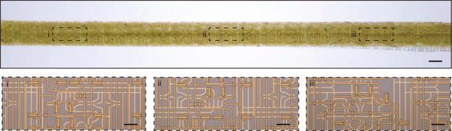 “纤维芯片”及其内部局部电路光学照片