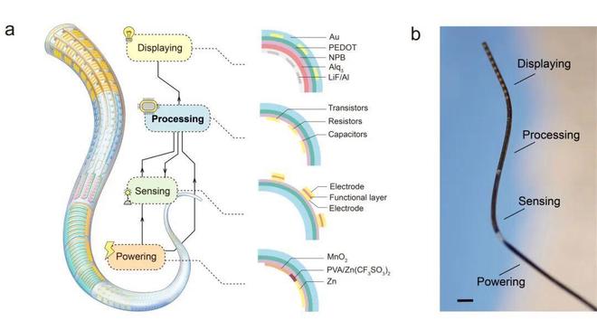 通过晶体管与电容、电阻等电子元件高效互连,“纤维芯片”可实现数字、模拟电路运算等功能,集成有机电化学晶体管后,还可完成神经计算任务。