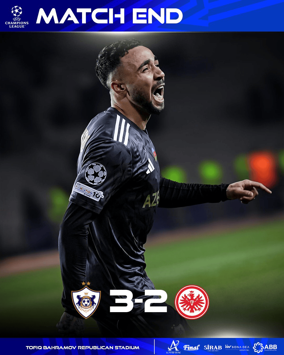虎扑01月22日讯欧冠联赛阶段,阿塞拜疆球队卡拉巴克主场3-2击败法兰克福。