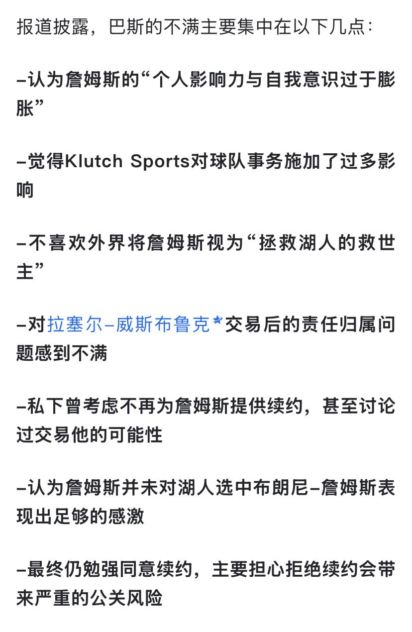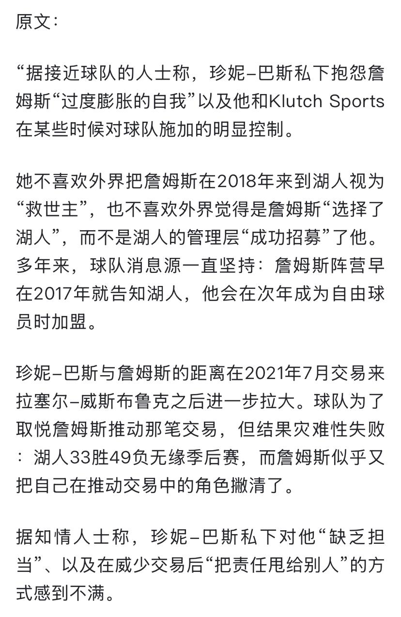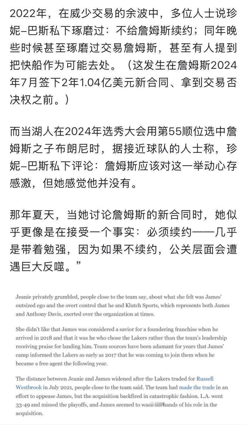曝出来了———来吃詹姆斯和珍妮阿姨的大瓜,及背后原因分析! 哈哈,涉及威少交易责任人、布朗尼、续约、湖人冠军荣誉等一系列。 这是迟早的事情,只是没想到俩人还都在湖人就曝出来了。我以为会是退役后…… 退役巡演、退役球衣、雕像看来都别想了,他在老板心中跟杜兰特在勇士一样只是雇佣军! 现在翻脸是逼詹姆斯主动提交易,珍妮钱收了得帮新老板清除他,半赛季都忍不了!