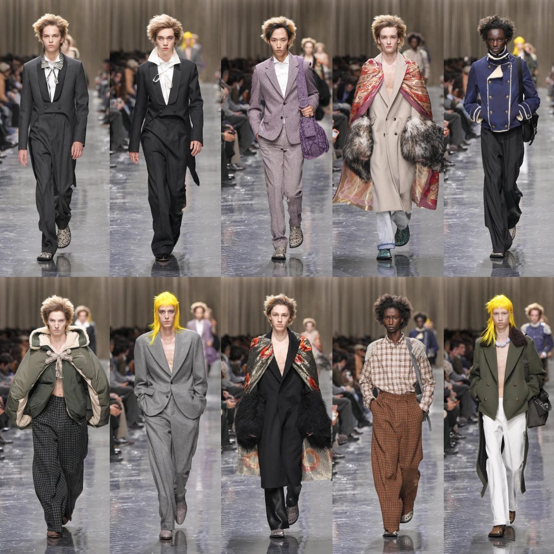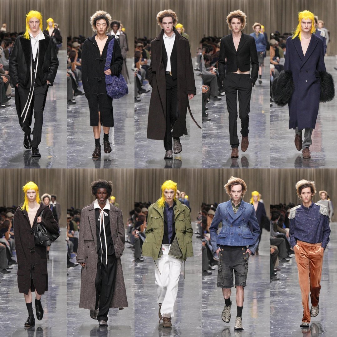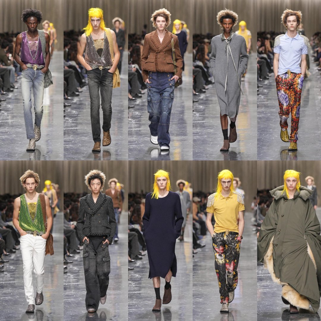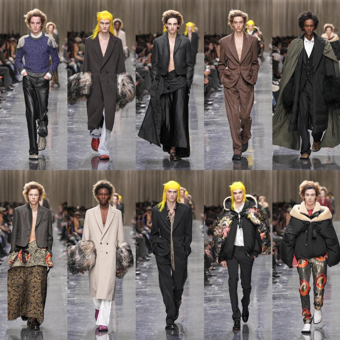 DIOR大秀男装周巴黎男装周 Jonathan Anderson × 迪奥大秀Jonathan Anderson执掌的Dior男装大秀,用亮片、黄假发与Glam Rock造型点燃了一场属于迪奥的“狂野时代”,仿佛Bowie在T台重生,叛逆又充满惊喜。这场秀的争议性同样鲜明:一边是先锋派盛赞其打破性别边界、激活品牌活力;另一边则有观众批评风格割裂、元素堆砌,与Dior“精致克制”的传统印象相去甚远。但恰恰是这种争议,让它成为本季最具记忆点的大秀——在保守与颠覆之间,迪奥完成了一次高风险的美学实验。