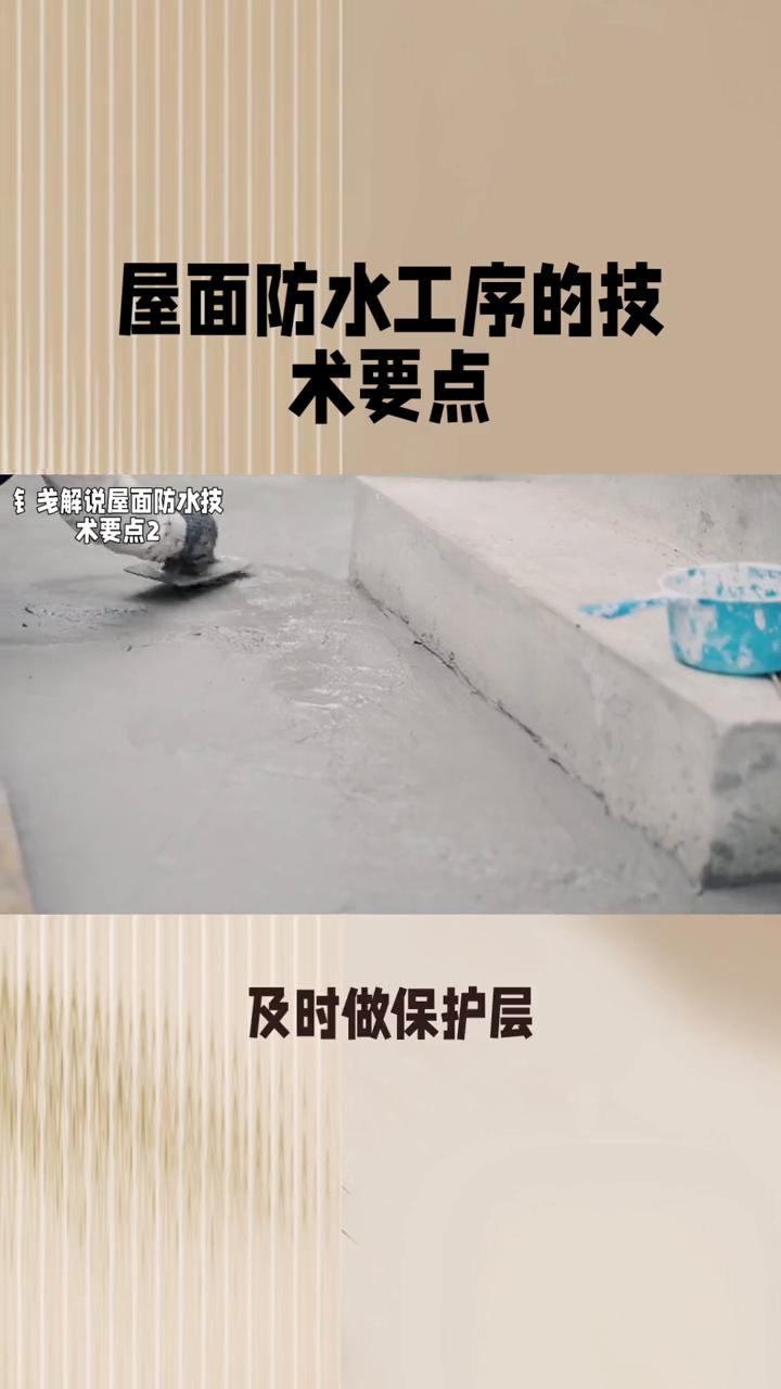 屋面防水工序的技术要点。 钅老解说屋面防水技术要点2。屋面防水工序的技术要点24: ·节点加强处理天沟、檐沟,找坡精准。卷材铺贴顺水流方向,搭接缝避开排水口,沟内增设附加层,收头处用压条固定并密封。 ·女儿墙、泛水,卷材上翻高度≥250mm,收头压入预留凹槽,用密封膏封严。转角处附加层宽度≥500mm,管道根部做锥形找坡,附加层包裹管道高度≥300mm。卷材/涂膜与管道粘贴密实,收口用金属箍固定+密封膏密封。 ·伸缩缝、变形缝,内嵌泡沫塑料填缝,顶部覆盖防水卷材,两端固定牢固,预留变形量。 ·保护层施工防水层验收合格后,及时做保护层。上人屋面用细石混凝土设分隔缝,不上人屋面用水泥砂浆或挤塑板,避免尖锐物划伤防水层。 ·验收与试水工序验收,每道工序隐蔽前验收,合格后方可进行下道工序闭水试验。防水层完成后,蓄水深度20-30mm,维持24-48小时,检查屋面无渗漏、无积水即为合格。坡屋面做淋水试验。