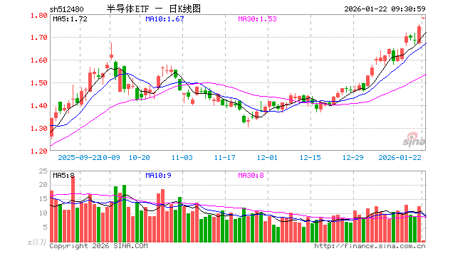 1月22日,半导体ETF(512480)开盘涨2.00%,报1.781元。半导体ETF(512480)重仓股方面,中芯国际开盘涨1.41%,寒武纪跌0.73%,海光信息涨4.82%,北方华创涨1.14%,澜起科技涨8.03%,兆易创新涨4.01%,中微公司涨1.18%,豪威集团涨0.67%,芯原股份涨0.65%,长电科技涨3.76%。