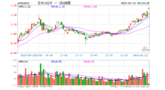 1月22日,芯片50ETF(516920)开盘涨2.59%,报1.266元。芯片50ETF(516920)重仓股方面,中芯国际开盘涨1.41%,寒武纪跌0.73%,海光信息涨4.82%,北方华创涨1.14%,澜起科技涨8.03%,兆易创新涨4.01%,中微公司涨1.18%,豪威集团涨0.67%,芯原股份涨0.65%,长电科技涨3.76%。