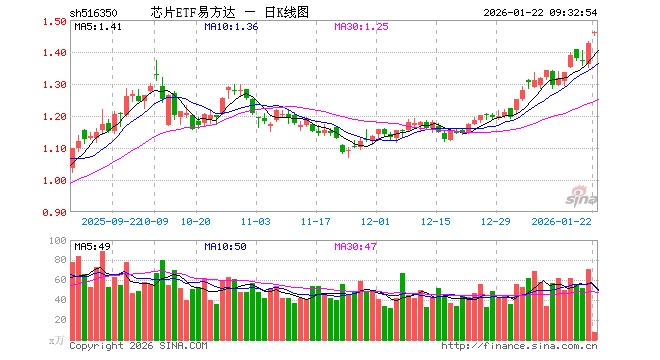 1月22日,芯片ETF易方达(516350)开盘涨2.24%,报1.458元。芯片ETF易方达(516350)重仓股方面,中芯国际开盘涨1.41%,寒武纪跌0.73%,海光信息涨4.82%,北方华创涨1.14%,澜起科技涨8.03%,兆易创新涨4.01%,中微公司涨1.18%,豪威集团涨0.67%,芯原股份涨0.65%,长电科技涨3.76%。