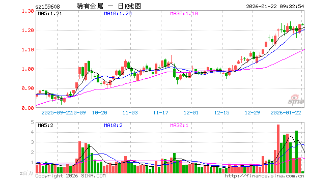 1月22日,稀有金属ETF(159608)开盘涨0.00%,报1.227元。稀有金属ETF(159608)重仓股方面,北方稀土开盘跌0.02%,洛阳钼业跌0.22%,华友钴业涨0.26%,盐湖股份涨0.89%,赣锋锂业涨0.63%,天齐锂业涨0.63%,中国稀土跌0.99%,中矿资源跌0.43%,盛和资源跌0.62%,西部超导涨1.03%。