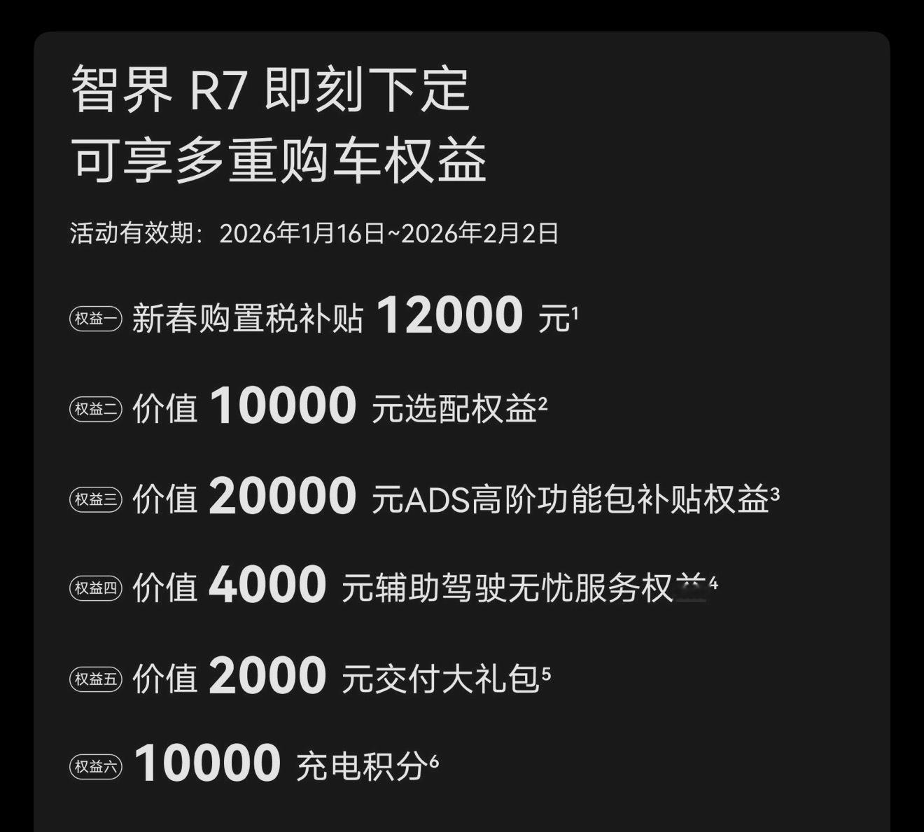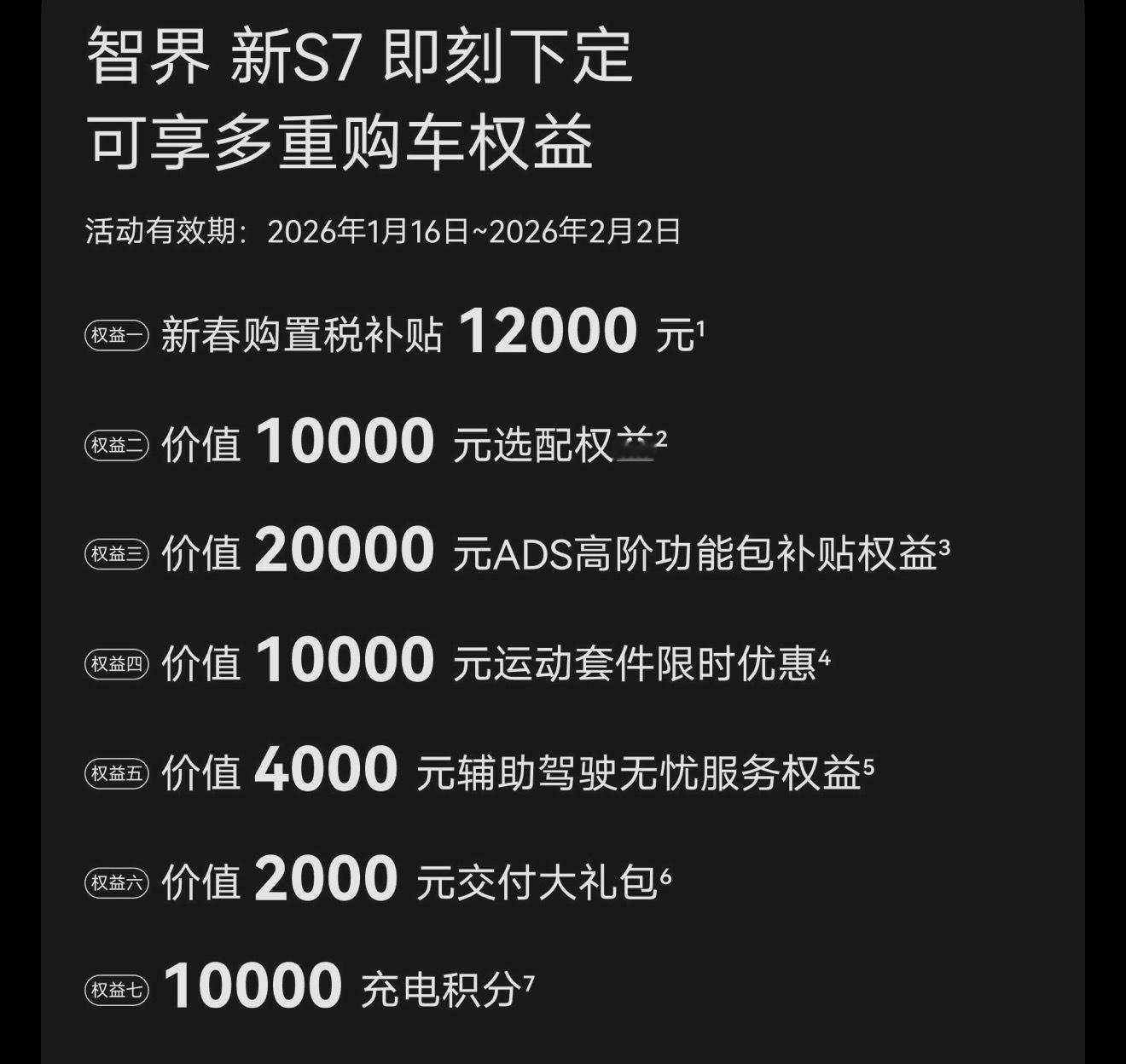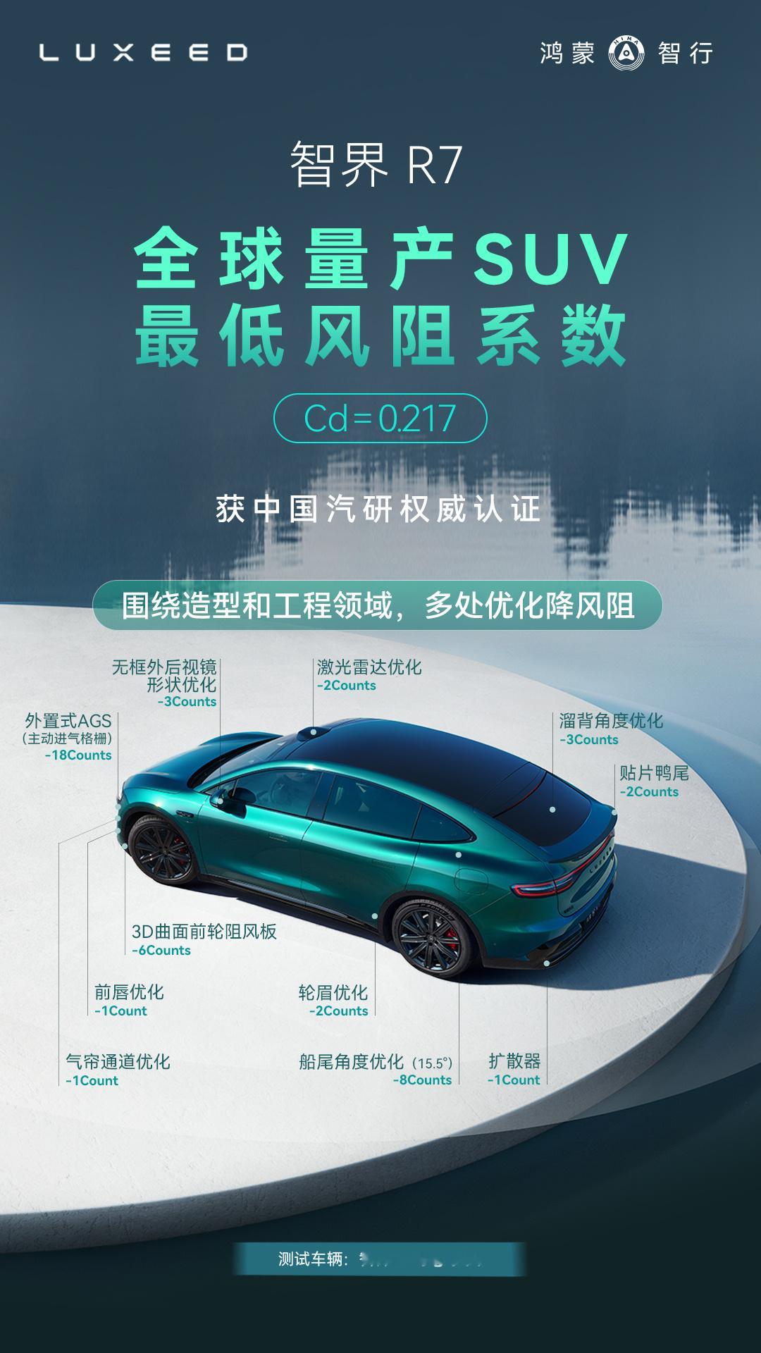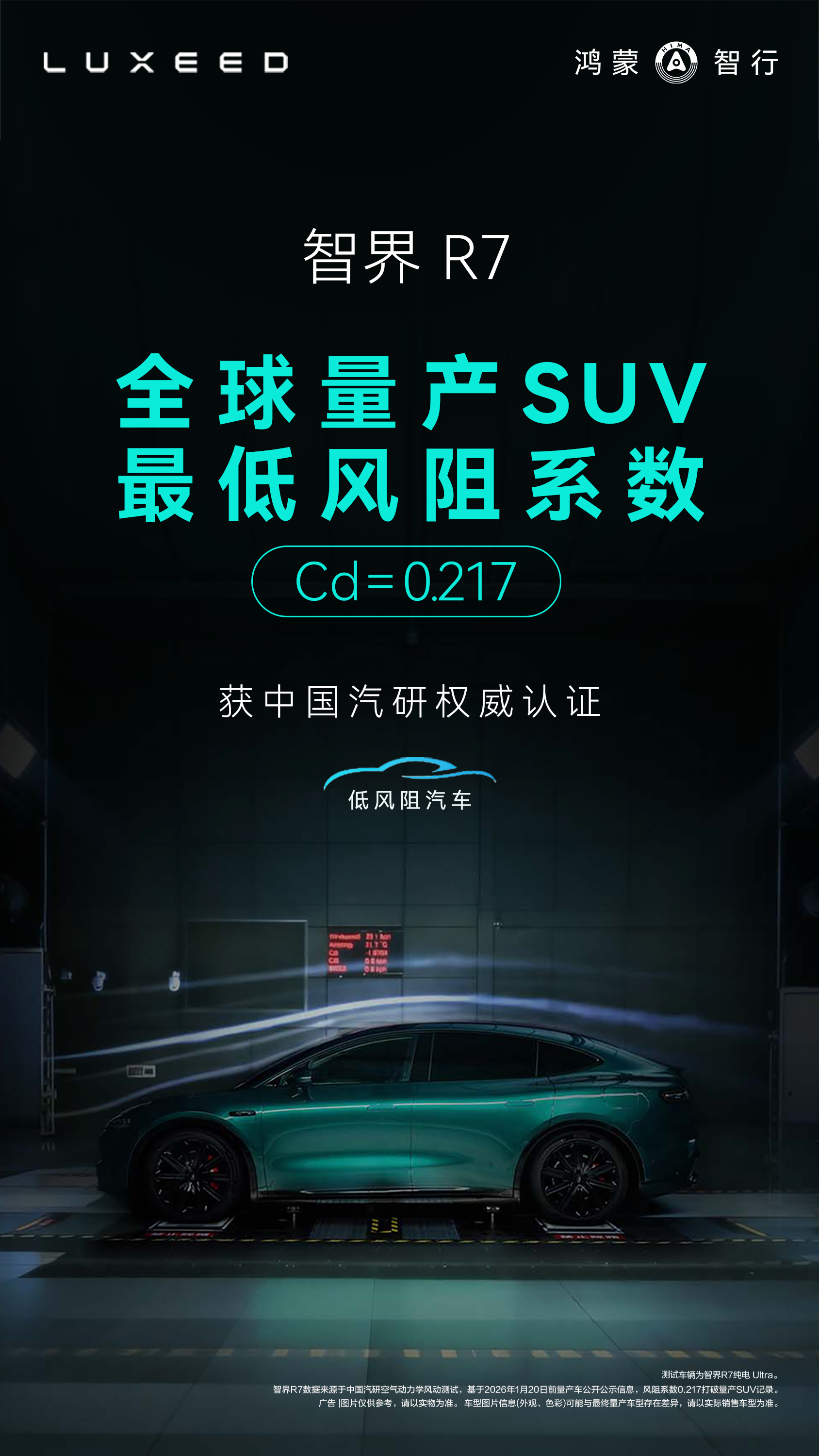 智界R7创全球量产SUV最低风阻纪录 智界R7纯电Ultra版低风阻被权威测试机构盖章了。这辆R7纯电Ultra在中国汽研专业风洞实验测试中,实测风阻系数低至0.217Cd。低风阻带来的优势:低能耗、更小风噪、更极致的驾乘体验。目前智界 R7也是 连续数月交付破万。春节大补贴也来了:全系可享至高12000元新春购置税补贴;智界R7至高享49000元购车权益;智界新S7至高59000元权益。仔细给大家看了一眼,图5,图6可以参考。你的续航有多少为风阻买了单