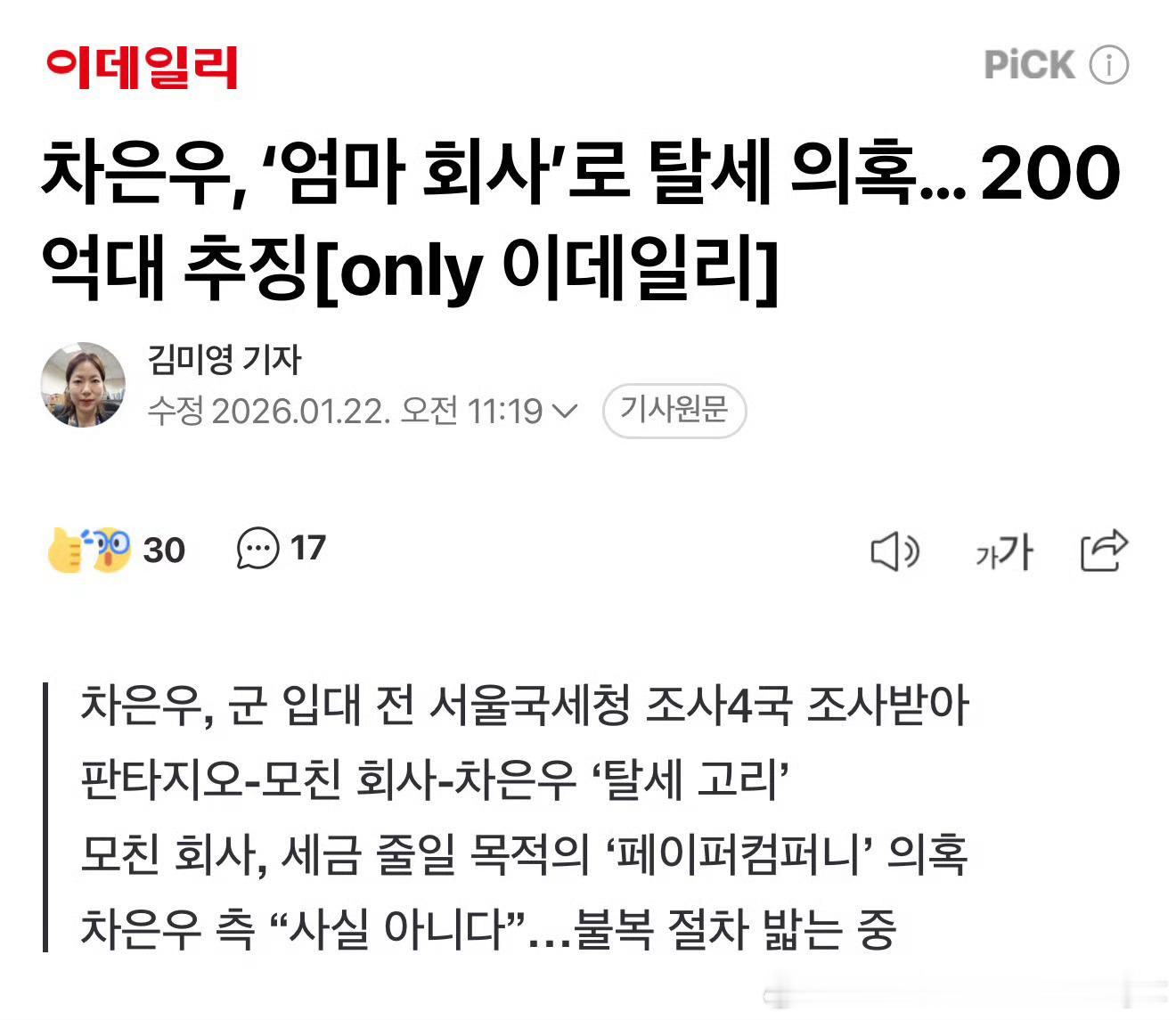 OMG,说车银优涉嫌利用他妈妈的公司逃税,去年春天就接受了首尔地方国税局的调查,