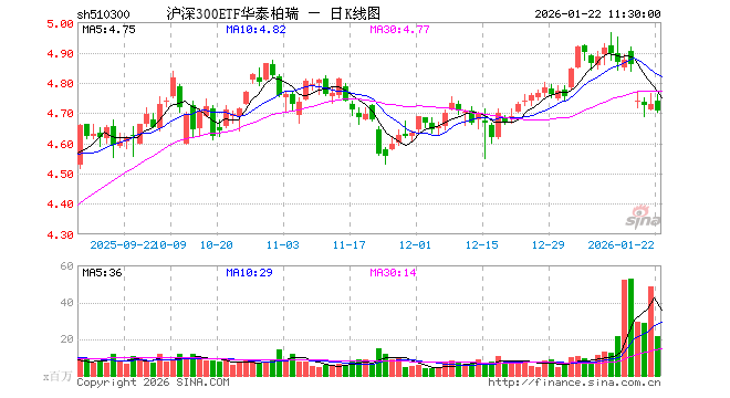 1月22日,截止午间收盘,沪深300ETF华泰柏瑞(510300)跌0.53%,报4.705元,成交额100.92亿元。沪深300ETF华泰柏瑞(510300)重仓股方面,宁德时代截止午盘跌2.80%,贵州茅台跌0.30%,中国平安跌1.47%,招商银行跌0.94%,紫金矿业跌2.31%,新易盛跌0.14%,中际旭创涨1.11%,美的集团跌0.03%,东方财富跌0.13%,长江电力跌0.71%。