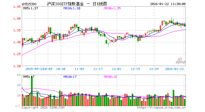 1月22日,截止午间收盘,沪深300ETF指数基金(515390)跌0.58%,报1.365元,成交额1776.89万元。沪深300ETF指数基金(515390)重仓股方面,宁德时代截止午盘跌2.80%,贵州茅台跌0.30%,中国平安跌1.47%,招商银行跌0.94%,紫金矿业跌2.31%,新易盛跌0.14%,中际旭创涨1.11%,美的集团跌0.03%,东方财富跌0.13%,长江电力跌0.71%。