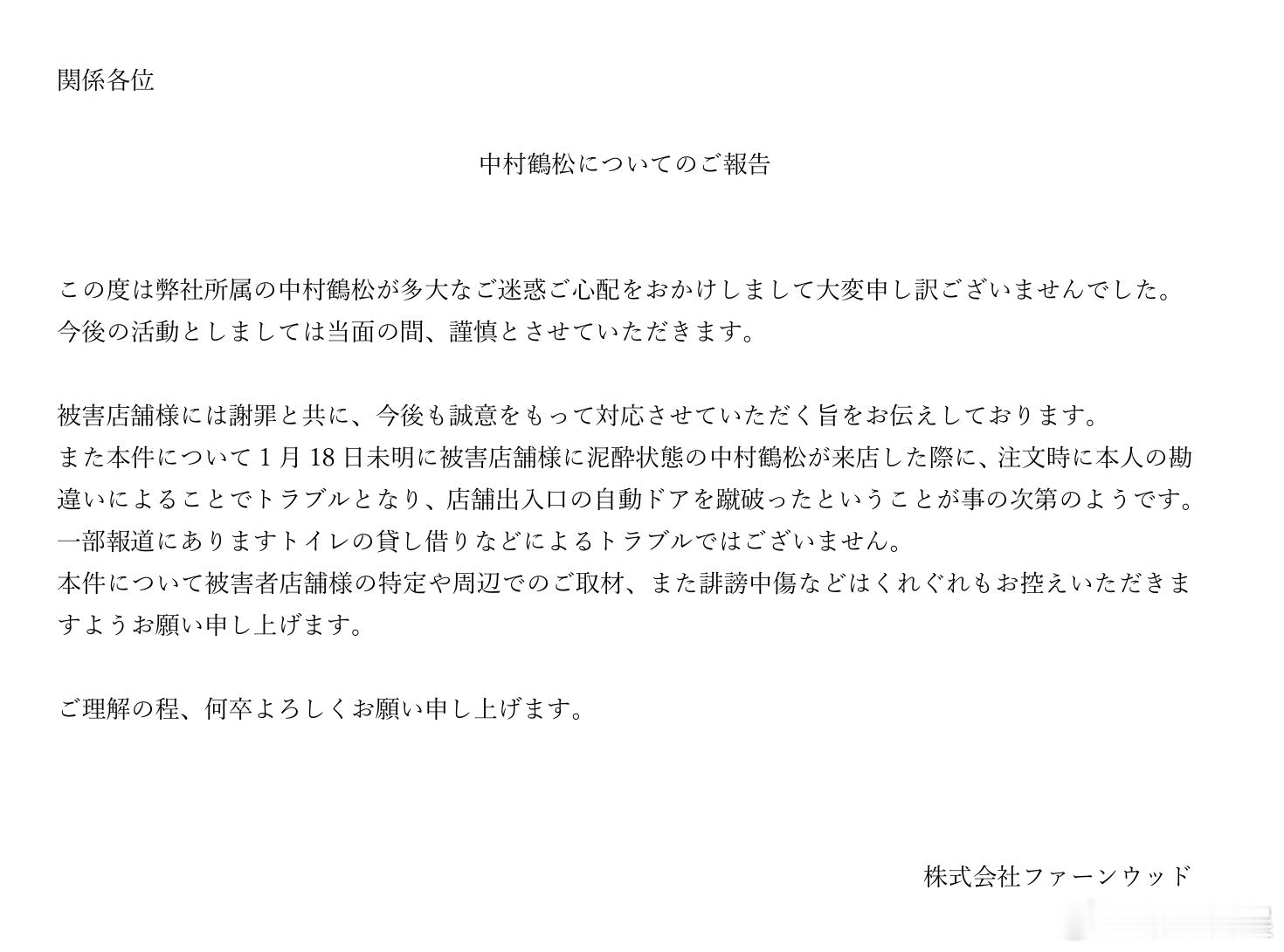 歌舞伎演员中村鹤松(30)将暂时进入谨慎期,原定于2月举行的初代中村舞鹤袭名仪式将被搁置。此前他因踢坏东京都台东区某餐饮店大门,被警视厅以涉嫌损坏建筑物为由当场逮捕。