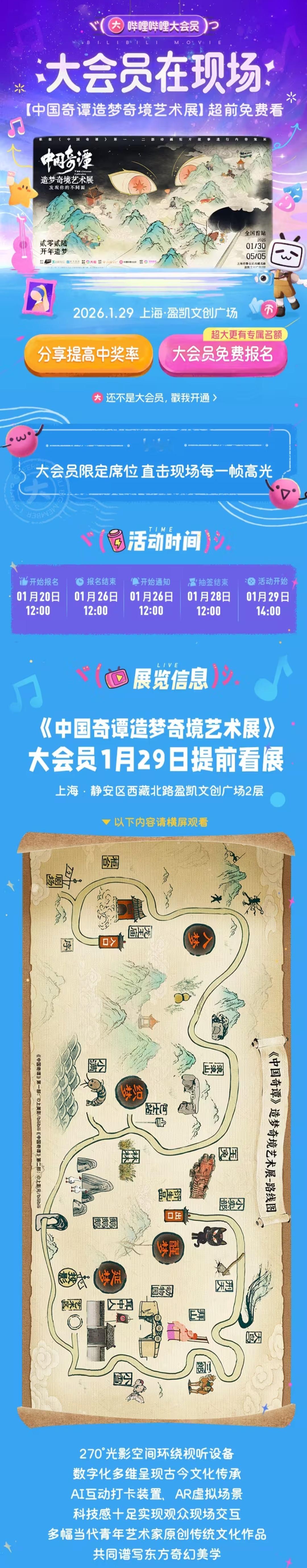 Bilibili/哔哩哔哩/B站大会员免费看🎦✨《中国奇谭》造梦奇境艺术展 上海 静安区 盈凯文创广场1月29日 14:00报名方式:网页链接