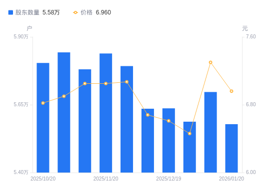 日期A股户数(户)流通A股户均持股数(股)户均持股市值(万元)2026-01-205578525798.7417.962026-01-095697025262.1118.442025-12-315587325758.1016.642025-12-195636625532.8116.882025-12-105635325538.7017.062025-11-285792424846.0517.572025-11-205839124647.3417.382025-11-105780524897.2017.552025-10-315843024630.8817.002025-10-205804124795.9616.91