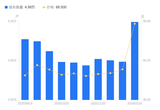 日期A股户数(户)流通A股户均持股数(股)户均持股市值(万元)2026-01-15498535590.9849.482025-12-10397227016.9441.722025-11-28400796954.4439.672025-11-20404186896.1138.962025-11-10387877186.0939.712025-10-31395097054.7740.112025-10-20396687026.4939.352025-10-10424066572.8239.002025-09-30449356202.8938.552025-09-19454666130.4534.10