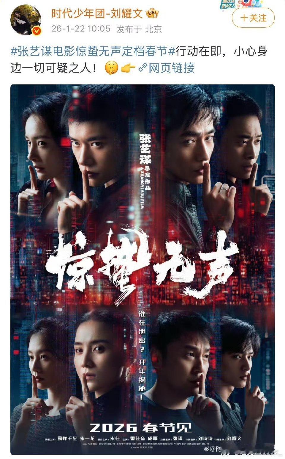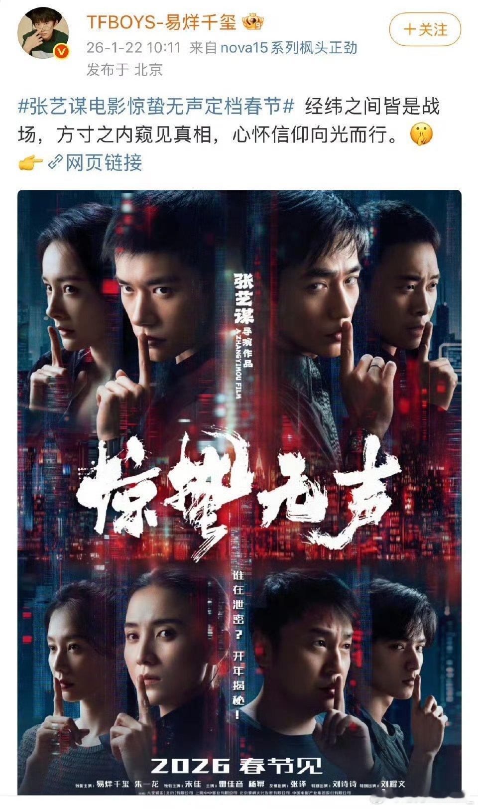 易烊千玺刘耀文师兄弟携手破案张艺谋《惊蛰无声》预告炸场!易烊千玺刘耀文师兄弟合体闯国安战场,一人硬核探案一人科技助攻,无声较量里的同门联手太戳了,春节档必冲!易烊千玺