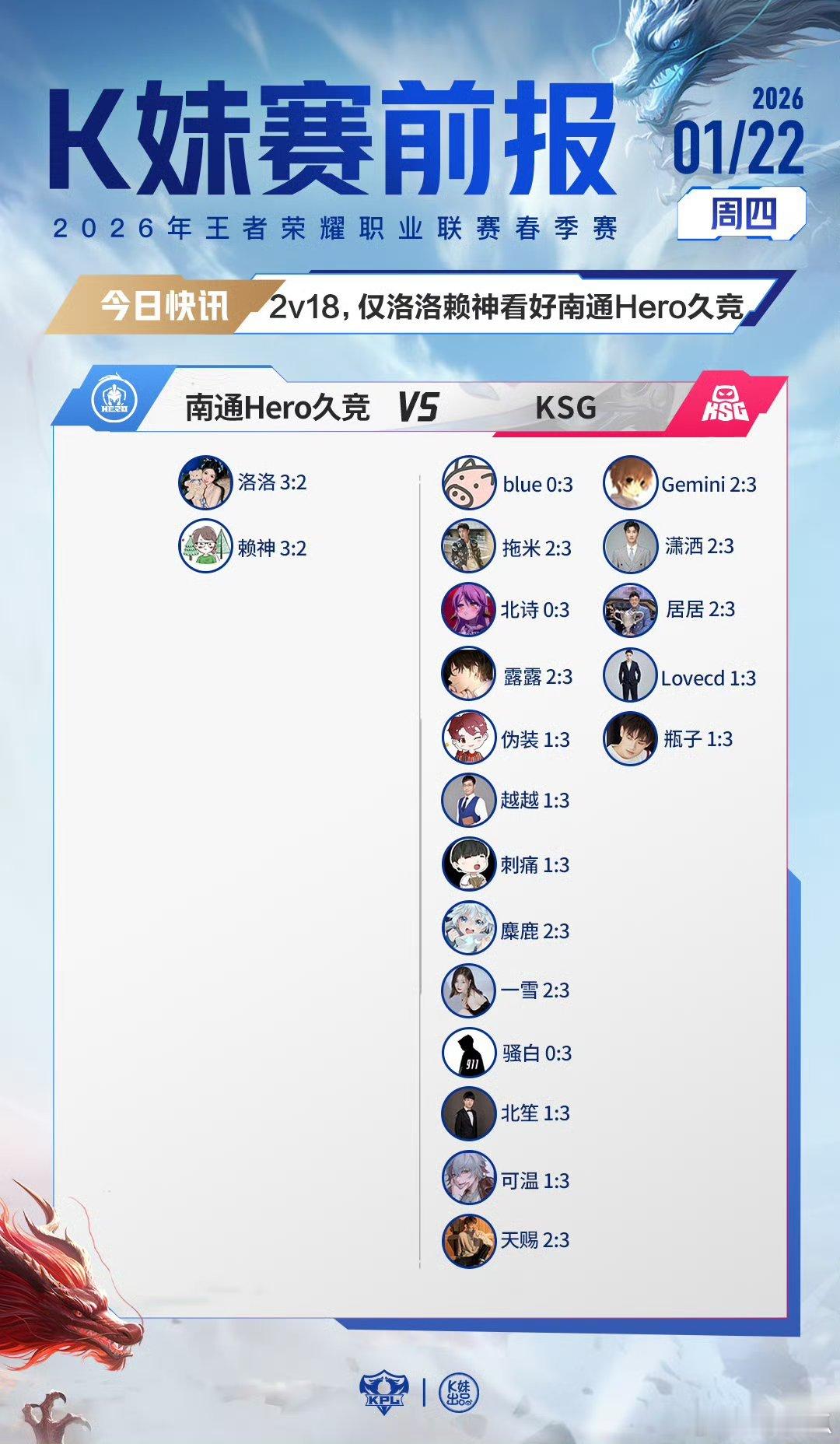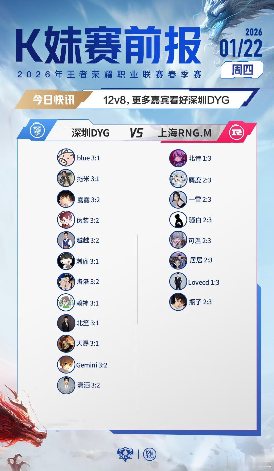 2026KPL春季赛|K妹赛前报10v10,双方支持者人数相同;12v8,更多嘉宾看好深圳DYG;2v18,仅洛洛赖神看好南通Hero久竞。