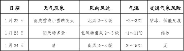 受寒潮影响,22日雨夹雪或小雪转阴天;23日阴天转多云,但早晨气温较低;24日晴,气温回升。