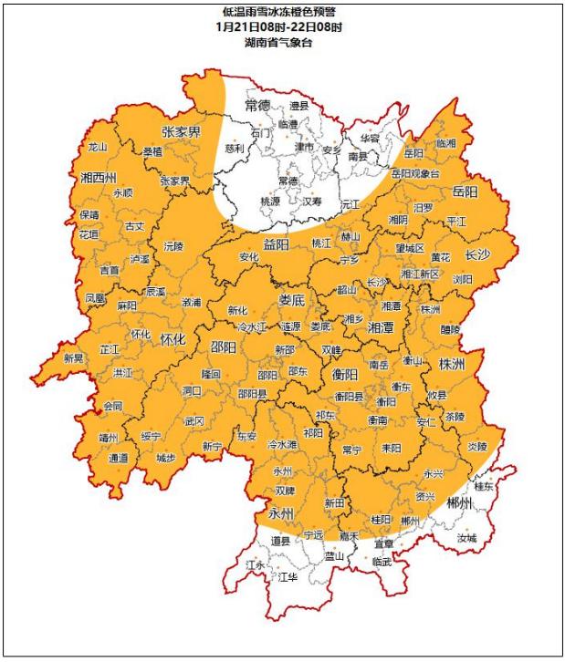 预计21日08时至22日08时,长沙、株洲、湘潭、衡阳、邵阳、岳阳、张家界西部、益阳南部、郴州北部、永州中北部、怀化、娄底、湘西州已出现雨凇或积雪,上述地区未来24小时仍将出现雨凇或积雪,且最低气温≤-2℃,请注意防范。