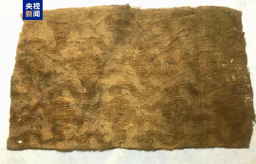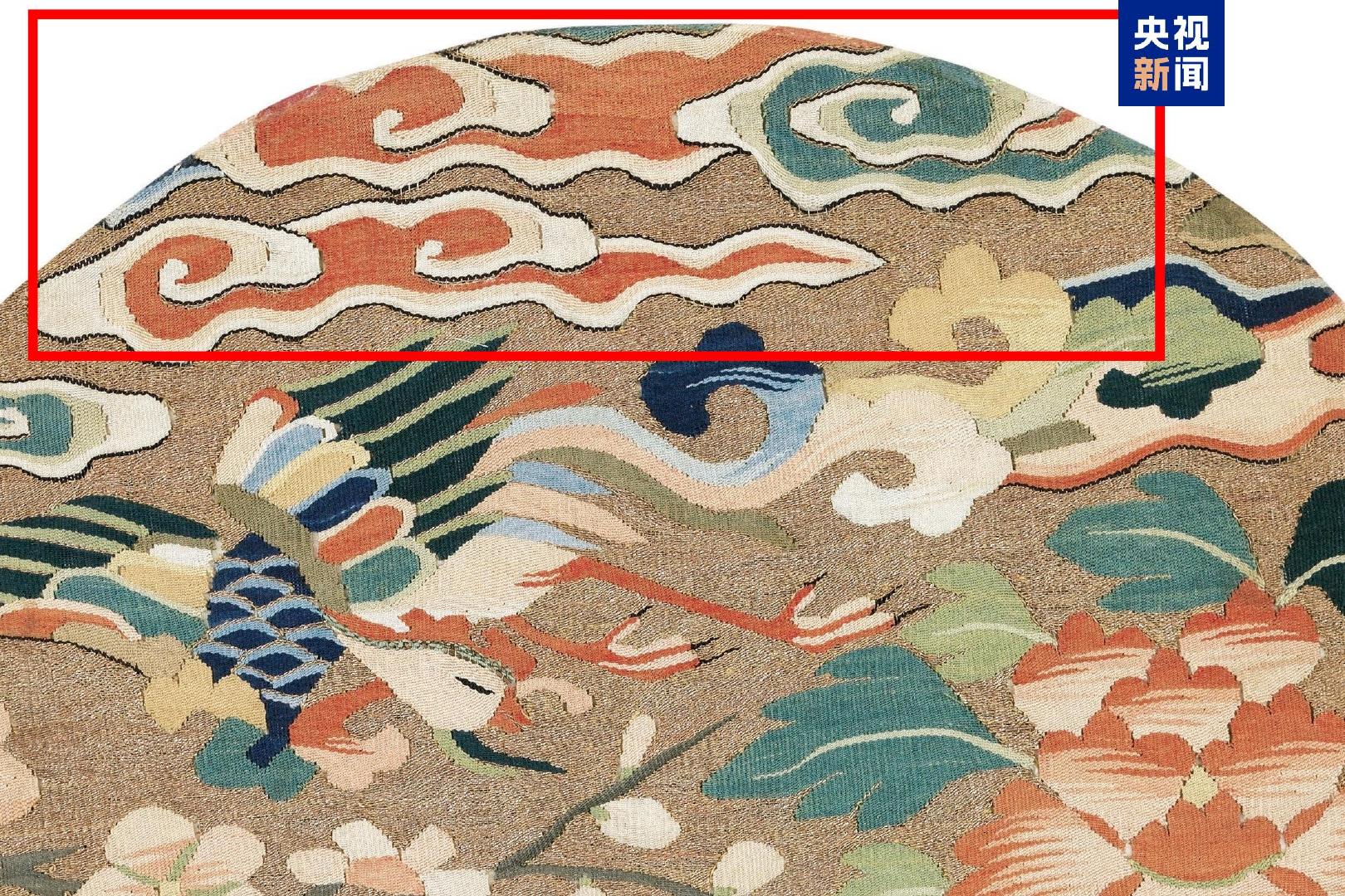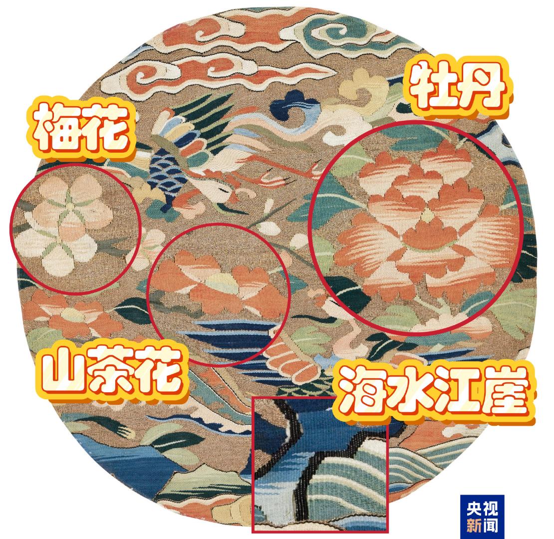 △纹部以五彩丝线织就,运用了缂丝的“缂鳞”“掼”“勾”和木梳戗等技法;地部采用捻金线织造,所用纬丝色彩约18种。