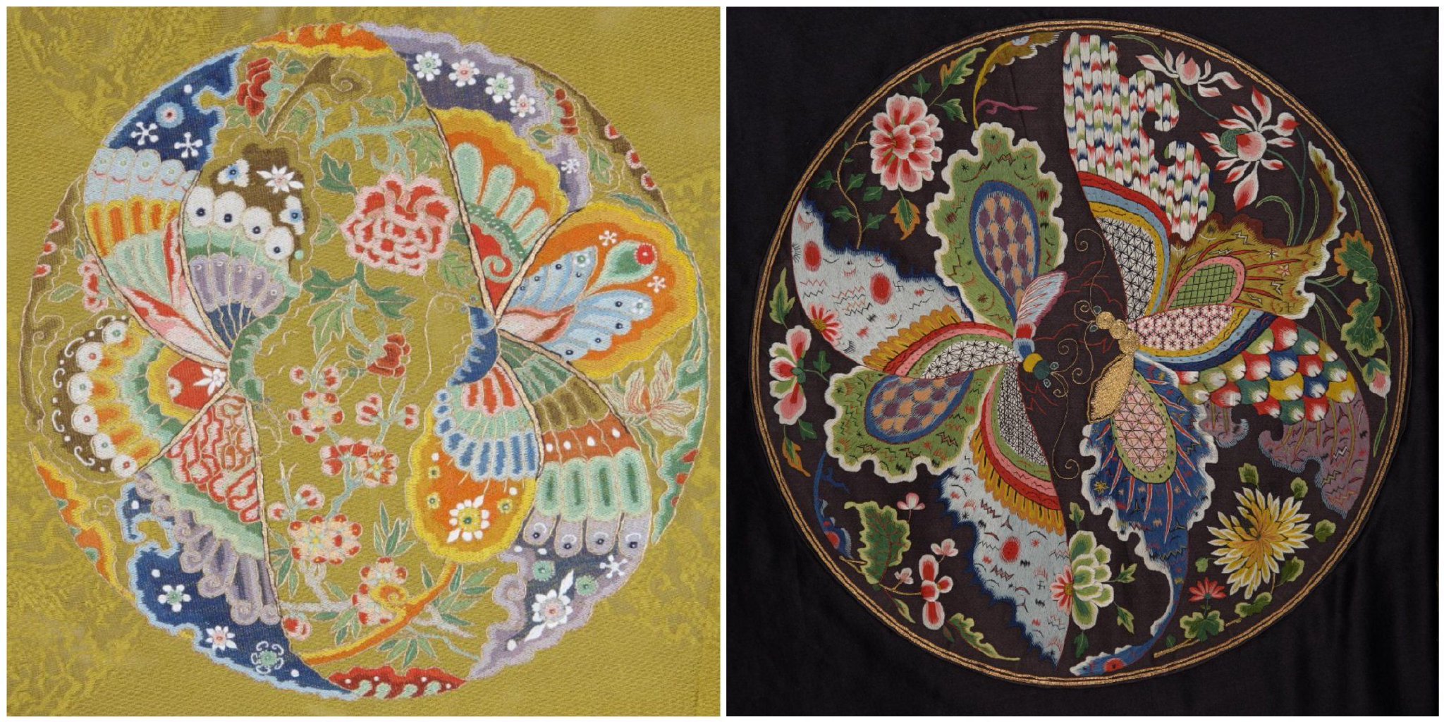 △清嘉庆香色纳纱八团喜相逢单袍(局部)故宫博物院藏;清乾隆石青色缎缀绣八团喜相逢夹褂(局部)故宫博物院藏