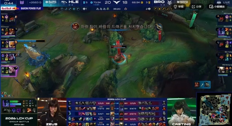 首局比赛前期双方平稳对线,第一波交锋则是打了个3V3的中单互换,Zeka沙皇一血!HLE三路线优直接打出2K经济优势!Zeus纳尔更是补刀+镀层15分钟对位压了Casting鳄鱼1500块!
