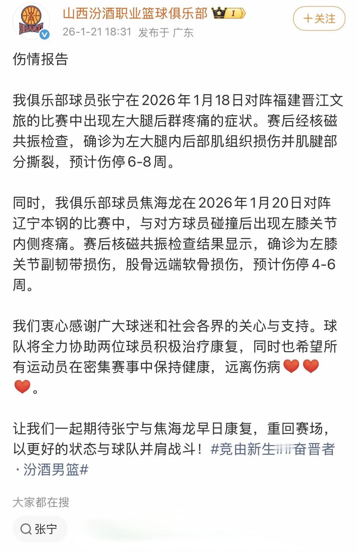 “CBA第一惨!” 山西官宣张宁焦海龙伤情 球员运动生涯短暂,健康弥足珍贵。如果靠肮脏的、违反体育道德的打法伤害对手,让对手对自己产生忌惮,因此来取得成绩,这无疑是可耻的,也注定走不远!不管你闹得有多欢,结局还是一群PTSD啃爆脬泡空欢喜! 没人统计这个地方用担架抬出去多少球员,“谁来也赢不了”我们都认了,别伤人行么! 天道有轮回,善恶之报,如影随形;种其因者,必食其果!