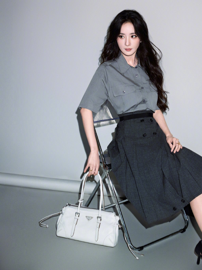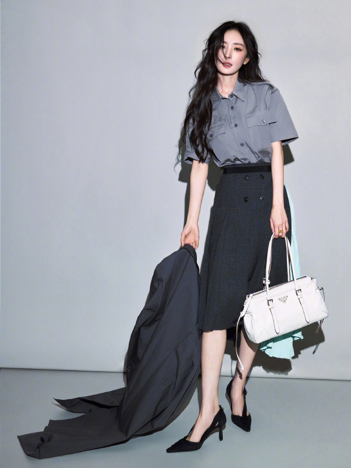 杨幂灰蓝撞色裙凸显独特气质,杨幂尖嘴高跟鞋助力气场升级,裙装的撞色元素时髦吸睛,