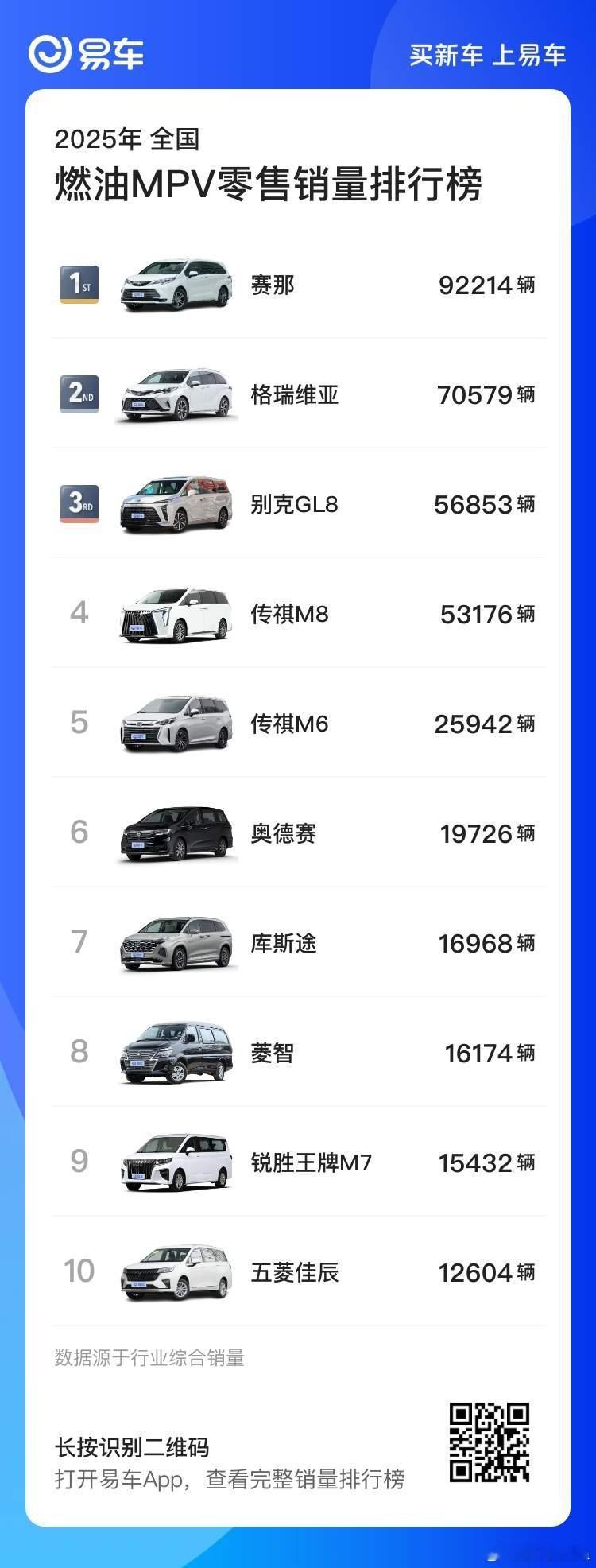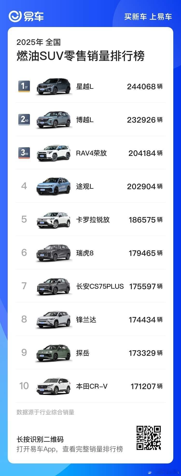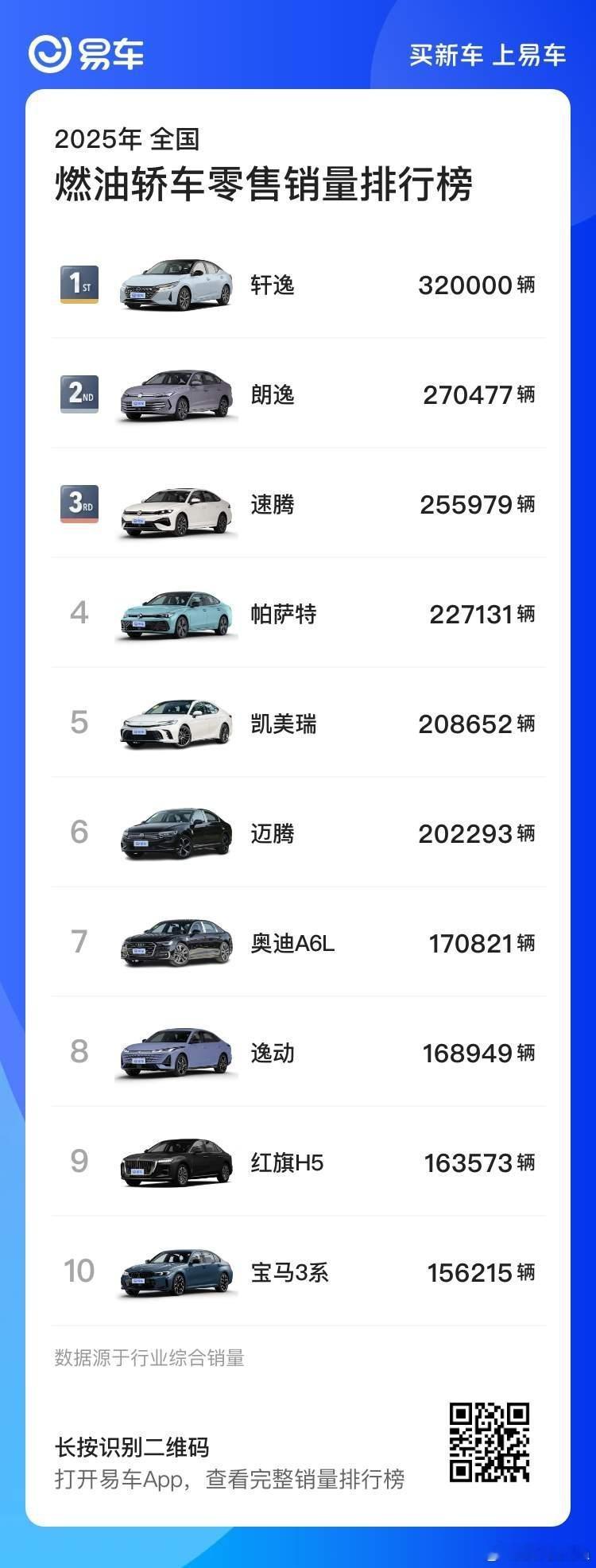 来自易车统计的【2025年燃油车型销量盘点】中,2025年燃油车销量前三是日产轩逸,上汽大众朗逸,一汽大众大众速腾。同样也是燃油轿车销量的前三名。燃油SUV的销量前三分别是吉利星越L,吉利博越L,丰田RAV4荣放。燃油MPV销量前三分别是丰田塞纳,丰田格瑞维亚,别克GL8。汽车情报局