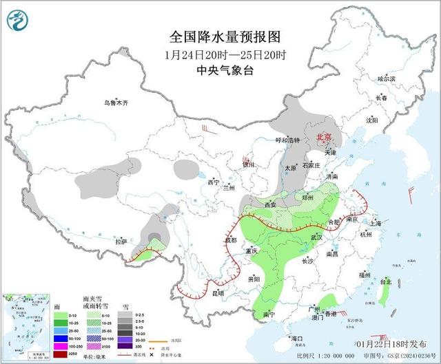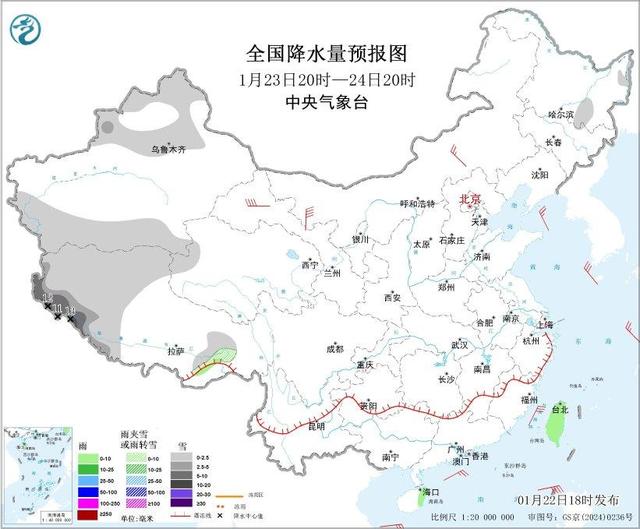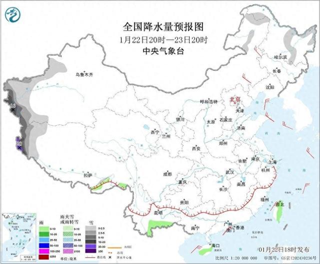 图1全国降水量预报图(1月22日20时-23日20时)