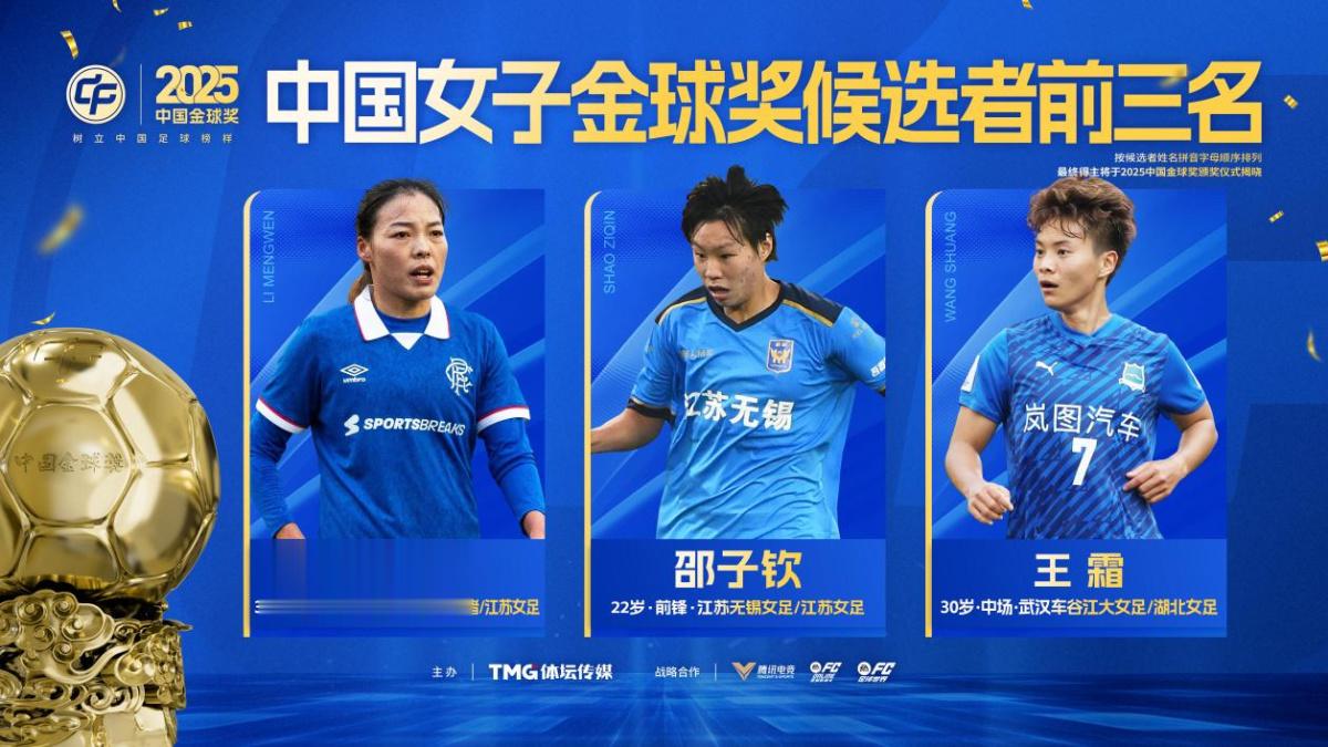 中国女子金球奖评选的前三名包括延续旅欧生涯的李梦雯、强势成为国家队年度最佳射手的邵子钦,以及在多线赛场率领武汉车谷江大创造佳绩的王霜。李梦雯在上一届评奖中就跻身前三,持续以闯荡欧洲推进职业生涯。而在国家队赛场不断破门并助力江苏队夺得全运会金牌的邵子钦,则是第一次从候选名单脱颖而出。作为中国女子金球奖历史上获奖次数最多的球员,王霜在2025年奉上诸多名场面,帮助武汉车谷江大登上亚洲之巅,强势回榜绝对实至名归。