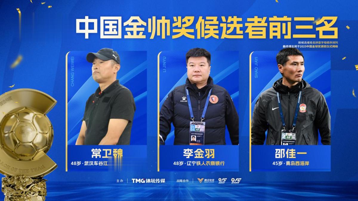 中国金帅奖前三名兼顾了中超、中甲和女足赛场:包括重振辽足的李金羽、开启中国男足执教生涯的邵佳一,以及将武汉车谷江大女足送上亚冠巅峰的常卫魏。回溯2025赛季,三人都在各自球队展现了值得信任的带队能力,既完成了竞技层面的赛季目标,也努力通过比赛内容展现自己的坚持与追求。
