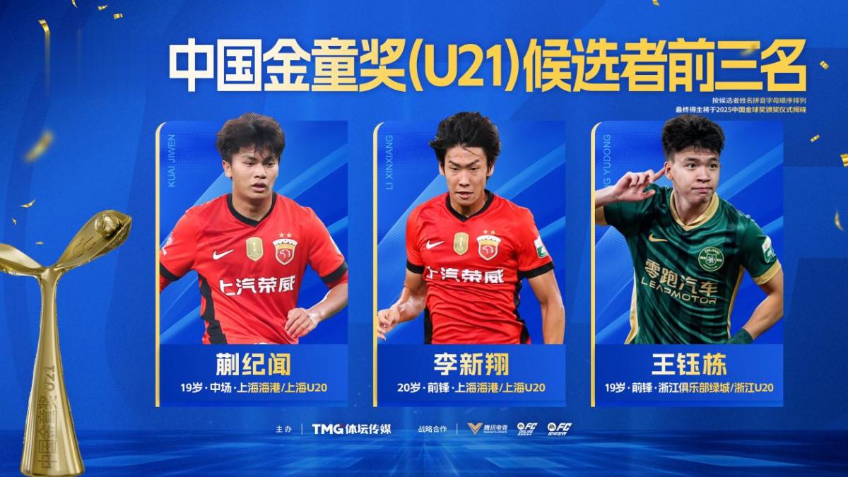 中国金童奖的激烈竞争尤为引人关注。经评委投票,蒯纪闻、李新翔和王钰栋在金童奖U21组别排名前三。其中,蒯纪闻和王钰栋刚刚随U23国家队一起杀入亚洲杯决赛,而他们的国字号队友徐彬、吾米提江和杨希也入围了2025中国金童奖(U21)的候选序列,最终分列评选的第4、第6和第8位。