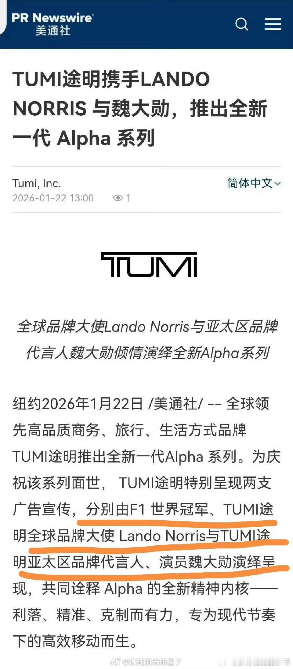 魏大勋TUMI亚太区品牌代言人美通社:TUMI途明推出全新Alpha系列广告大片将由魏大勋和F1世界冠军分别演绎!魏大勋还是太权威了魏大勋tumi亚太区品牌代言人