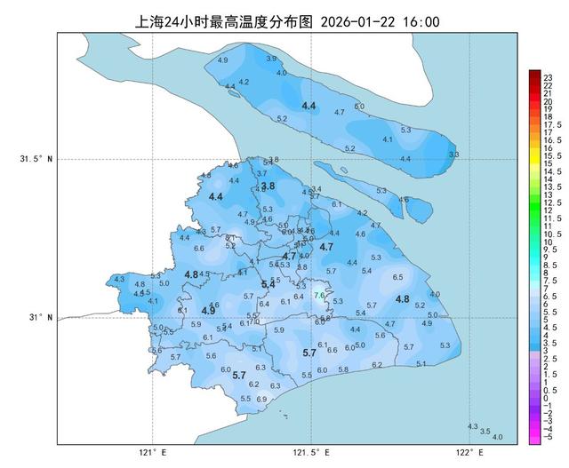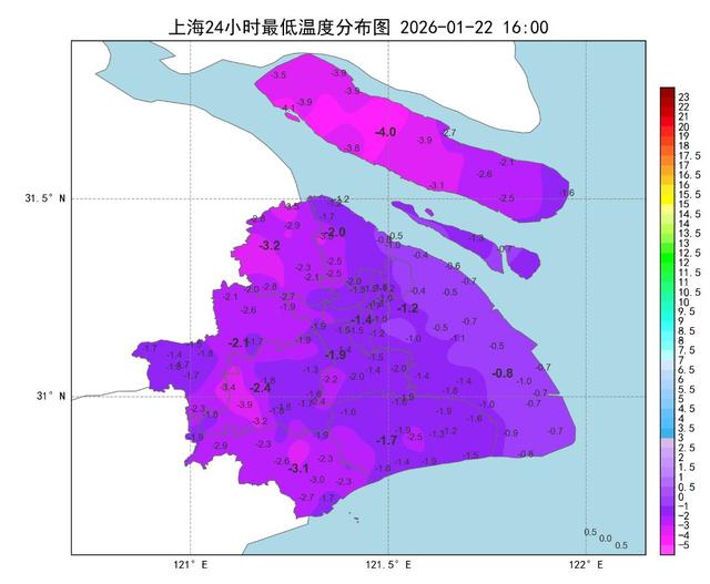 今天早晨,全市最低气温都在冰点以下,崇明站-4.0℃全市最低。白天晴到多云,阳光虽然在线,但并不暖和,全市最高气温多在4、5℃上下,其中市区徐家汇站4.7℃。
