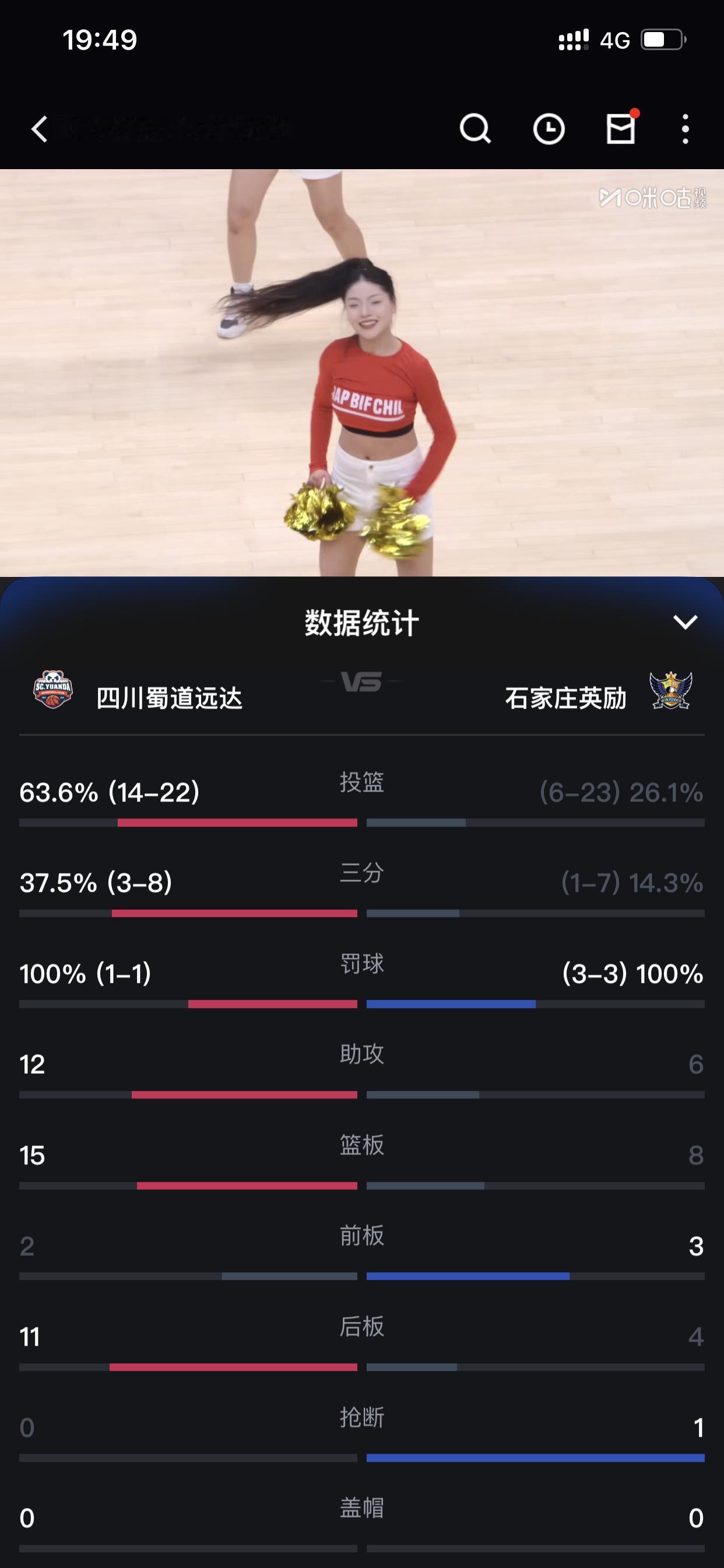 四川女篮首节内外结合、多点开花 第一节打出来的效果是如我早上发文所设想的那样,李缘、王思雨两个人一人一个三分球开局,通过有力防守和团队配合的进攻,打了对方一个19:0,第一节前五分钟三分球命中率高达75%备受争议的李缘是最近两场三分球投的最好的球员),第一节32:16结束。 第二节开始后,首发阵容在第一节末段已陆续换下,可是衔接段的替补阵容没能续上火力,而石家庄女篮逐渐找自己的比赛节奏,但四川女篮防守还是积极,没有让对方有太多的进攻机会;直到首发阵容再次换上场,再一次把比分稳住在15左右。 不过,第二节总体而言,没有延续第一节的状态,对方也是逐渐适应了四川女篮的比赛节奏,加上四川女篮的三分球命中率在第二节直线下降,以及失误的原因,所以也是一度在上半场最后一分多钟时被追近个位数,好在这个时候四川女篮球员抓住对方的机会,稳住了节奏,再一次让比分分差定格在15分以上,以55:40结束上半场! 今天这上半场要夸夸贾赛琪,因为她今天进攻打的很主动,已经好久没有看到这么主动的贾赛琪了。 看下半场如何!