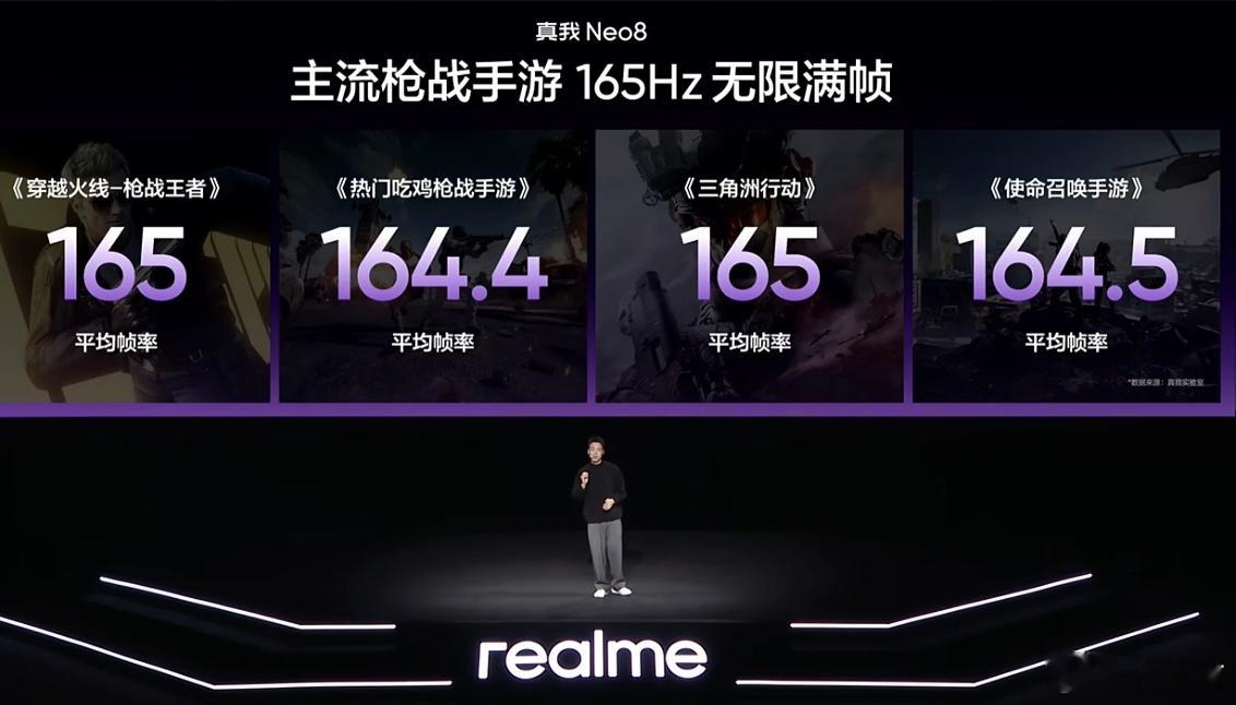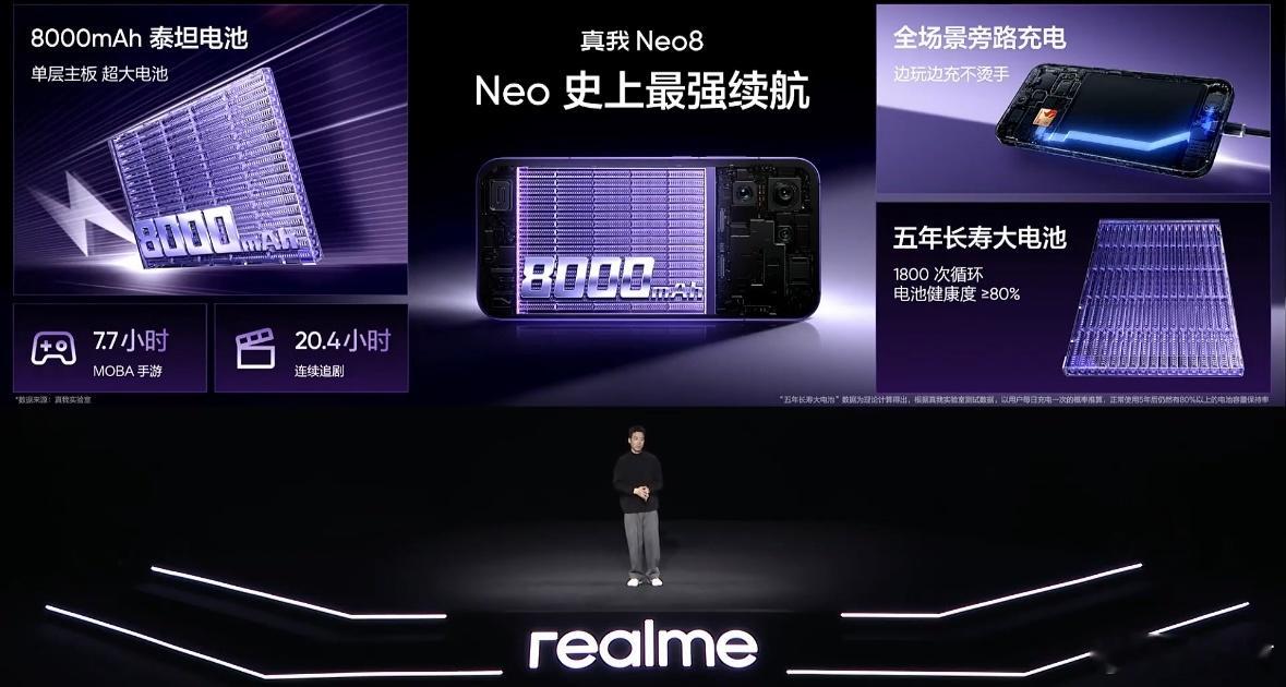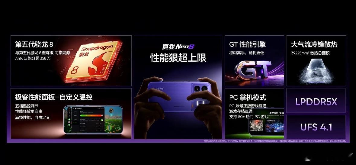 新机来了 真我Neo8终于发布!• 处理器:骁龙8 Gen5 + LPDDR5X + UFS4.1• 屏幕:6.78英寸三星M14直屏,2772×1272分辨率,165Hz刷新率,原生120帧+1.5K超分• 影像:前置16MP;后置50MP IMX896 OIS主摄 + 8MP超广 + 50MP 3.5X OIS潜望长焦• 续航:8000mAh电池 + 80W快充• 其他:3D超声波指纹,IP66+68+69防护,晶铠玻璃;X轴马达0809,双扬声器,NFC,红外遥控;双频GPS+三频北斗,苍穹信号芯片S1;厚8.3mm,重215g• 游戏特性:游戏温控/频率自定义,PC掌机模式,主流枪战手游165Hz满帧