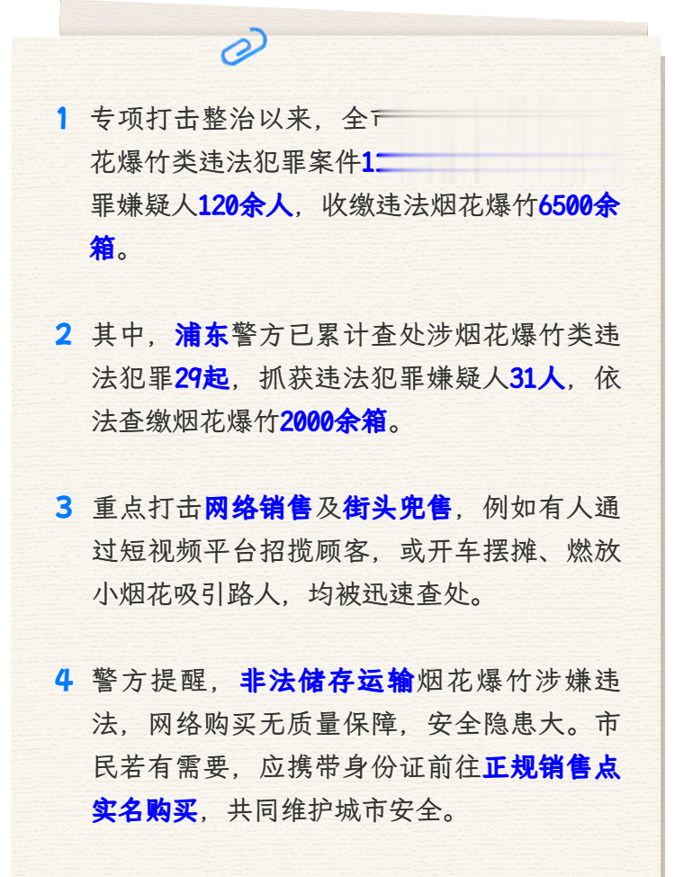 警方提示:非法储存、运输烟花爆竹行为涉嫌违法犯罪。购买没有质量保证的烟花爆竹极易引发火灾等安全隐患。春节期间,上海设有专门正规的烟花爆竹销售点位,满足市民节日燃放需求。市民如需购买,可携带本人有效身份证件,前往指定零售点现场实名登记购买,切勿轻信网络售卖信息,共同守护城市平安与生态环境。