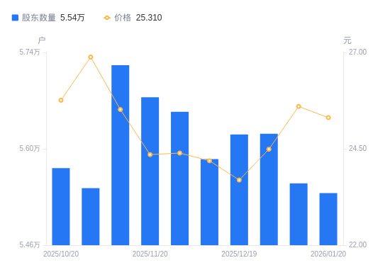 日期A股户数(户)流通A股户均持股数(股)户均持股市值(万元)2026-01-205535611207.9928.372026-01-095549811179.3228.622025-12-315622011035.7527.032025-12-195620811038.1026.152025-12-105585211108.4626.872025-11-285653910973.4826.762025-11-205674810933.0726.622025-11-105721510843.8327.672025-10-315542811193.4430.092025-10-205571911134.9828.68