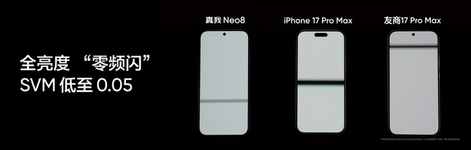 在亮度方面,真我Neo8实现手动最高1000nit、全局峰值1800nit、局部峰值6500nit以及阳光显示3800nit的全场景顶级通透体验,阳光显示状态下103%P3超广色域让色彩还原更准确,高亮不再惨白。新发光材料更带来了更耐久的发光寿命,真我Neo8采用更严苛的T95亮度衰减指标,实测成绩长达1500小时,屏幕寿命较行业提升50%。护眼方面支持全新绿野护眼方案,支持全亮度DC调光,SVM低至0.05,并获得了莱茵无频闪认证,硬件级低蓝光与AI护眼功能,全场景守护用眼健康,让久玩更护眼。
