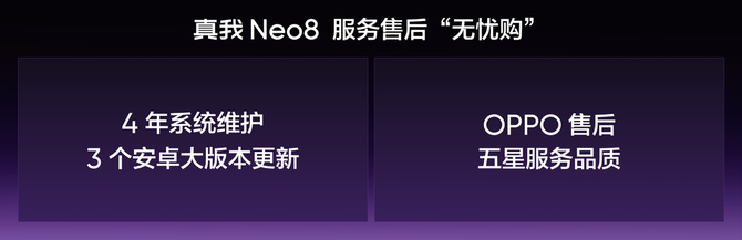 在强大产品之上,真我Neo8更提供"无忧购"服务保障。系统维护方面,真我Neo8承诺4年系统维护与3个安卓大版本更新,从大一用到大四,系统仍能保持流畅如新的使用体验。售后服务方面,真我手机将于今年4月全面接入OPPO售后服务体系,享受OPPO五星服务品质,包括面对面维修、可视化寄修服务、30天性能故障包换、维修部件至高180天质保等全方位保障,让用户买得放心、用得舒心。