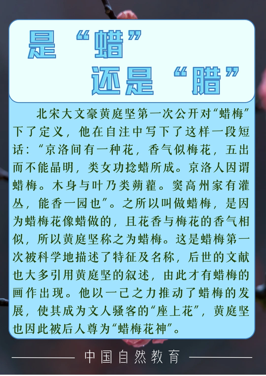 北宋大文豪黄庭坚第一次公开对"蜡梅"下了定义,他在自注中写下了这样一段短话:"京洛间有一种花,香气似梅花,五出而不能晶明,类女功捻蜡所成。京洛人因谓蜡梅。木身与叶乃类蒴藿。窦高州家有灌丛,能香一园也"。之所以叫做蜡梅,是因为蜡梅花像蜡做的,且花香与梅花的香气相似,所以黄庭坚称之为蜡梅。这是蜡梅第一次被科学地描述了特征及名称,后世的文献也大多引用黄庭坚的叙述,由此才有蜡梅的画作出现。他以一己之力推动了蜡梅的发展,使其成为文人骚客的"座上花",黄庭坚也因此被后人尊为"蜡梅花神"。