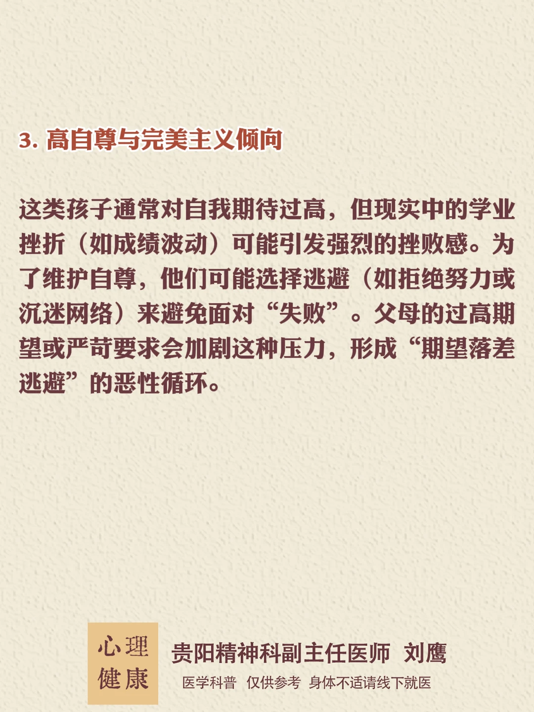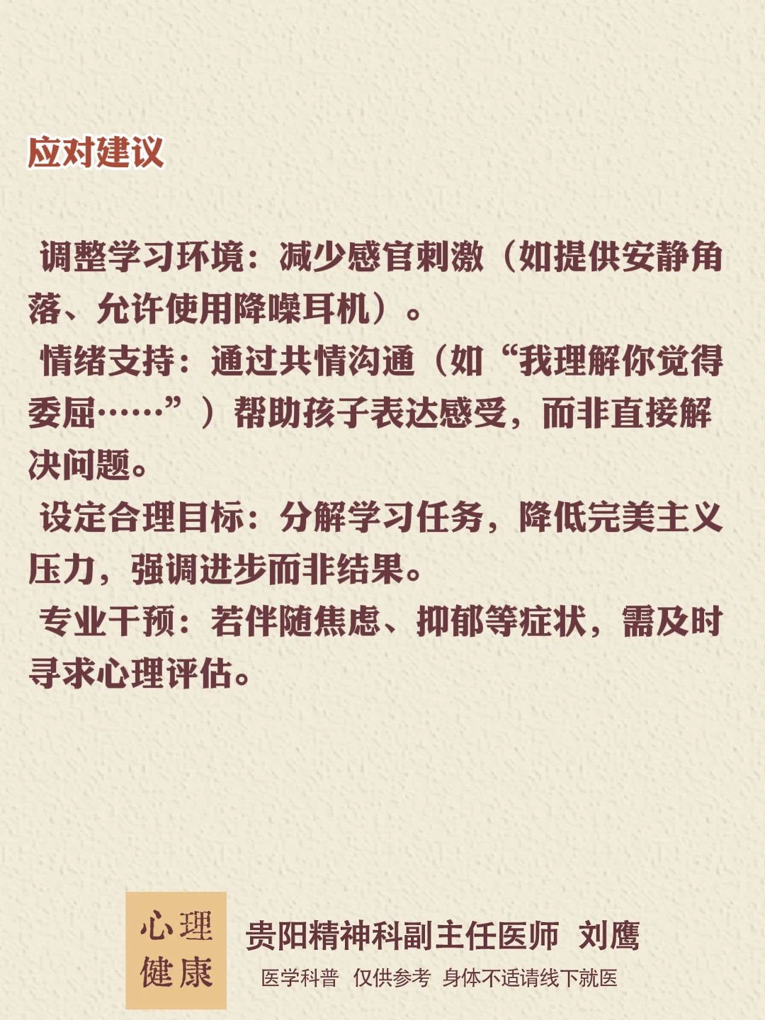 应对建议 调整学习环境:减少感官刺激(如提供安静角落、允许使用降噪耳机)。 情绪支持:通过共情沟通(如“我理解你觉得委屈……”)帮助孩子表达感受,而非直接解决问题。 设定合理目标:分解学习任务,降低完美主义压力,强调进步而非结果。 专业干预:若伴随焦虑、抑郁等症状,需及时寻求心理评估。