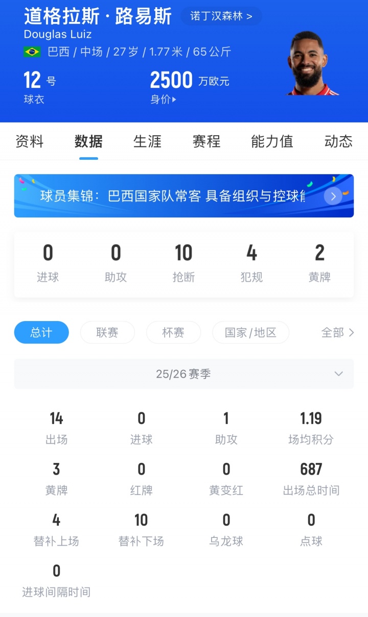 道格拉斯·路易斯现年27岁,巴西中场。本赛季他出场14场为球队贡献1次助攻,目前其德转身价为2500万欧。