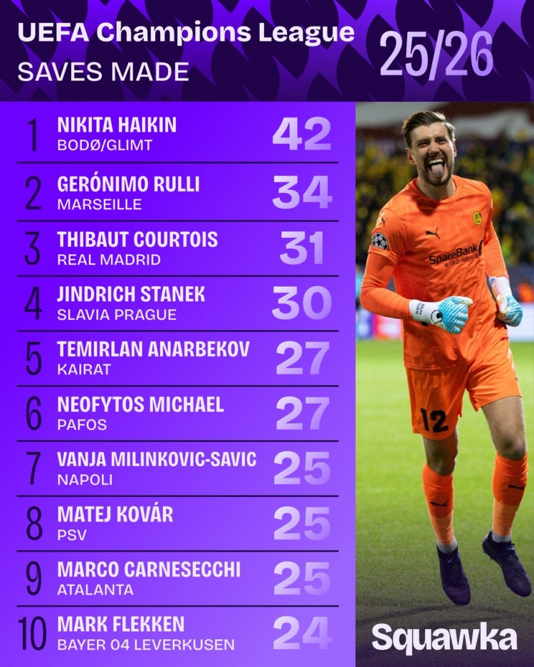 直播吧1月23日讯数据机构Squawka统计本赛季欧冠门将扑救次数,博德闪耀门将尼基塔·哈伊金以42次居首。