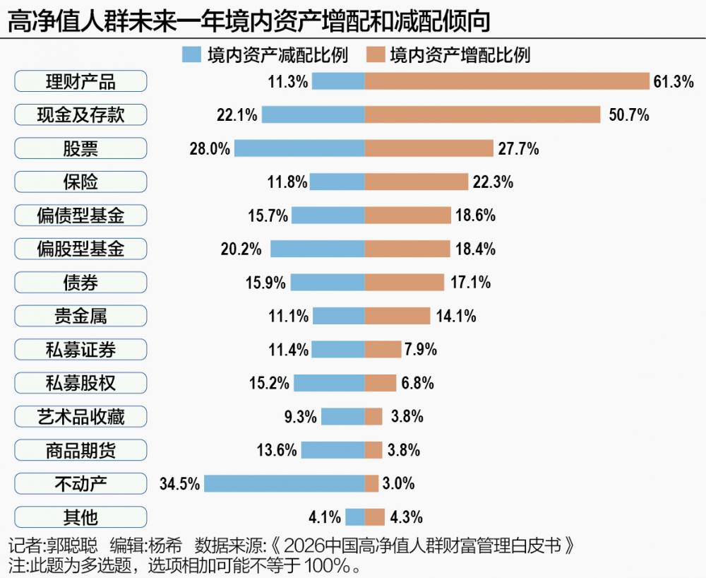 六是境内配置稳健为先,攻守兼备:高净值人群境内资产配置呈现出攻守兼备的特征。当前持仓以理财产品、存款及保险为主导,构成组合的安全基石;与此同时,超三成高净值人群配置了股票类资产,在控制整体波动的基础上寻求收益增强。从调整趋势来看,未来一年,高净值人群中超半数计划增持理财产品与现金存款,净增配意愿显著;而在股票上则呈现分歧,增持与减持意愿比例接近;以不动产为代表的非金融资产则倾向于减配。高净值人群资产组合正向标准化、更高流动性的金融资产集中。