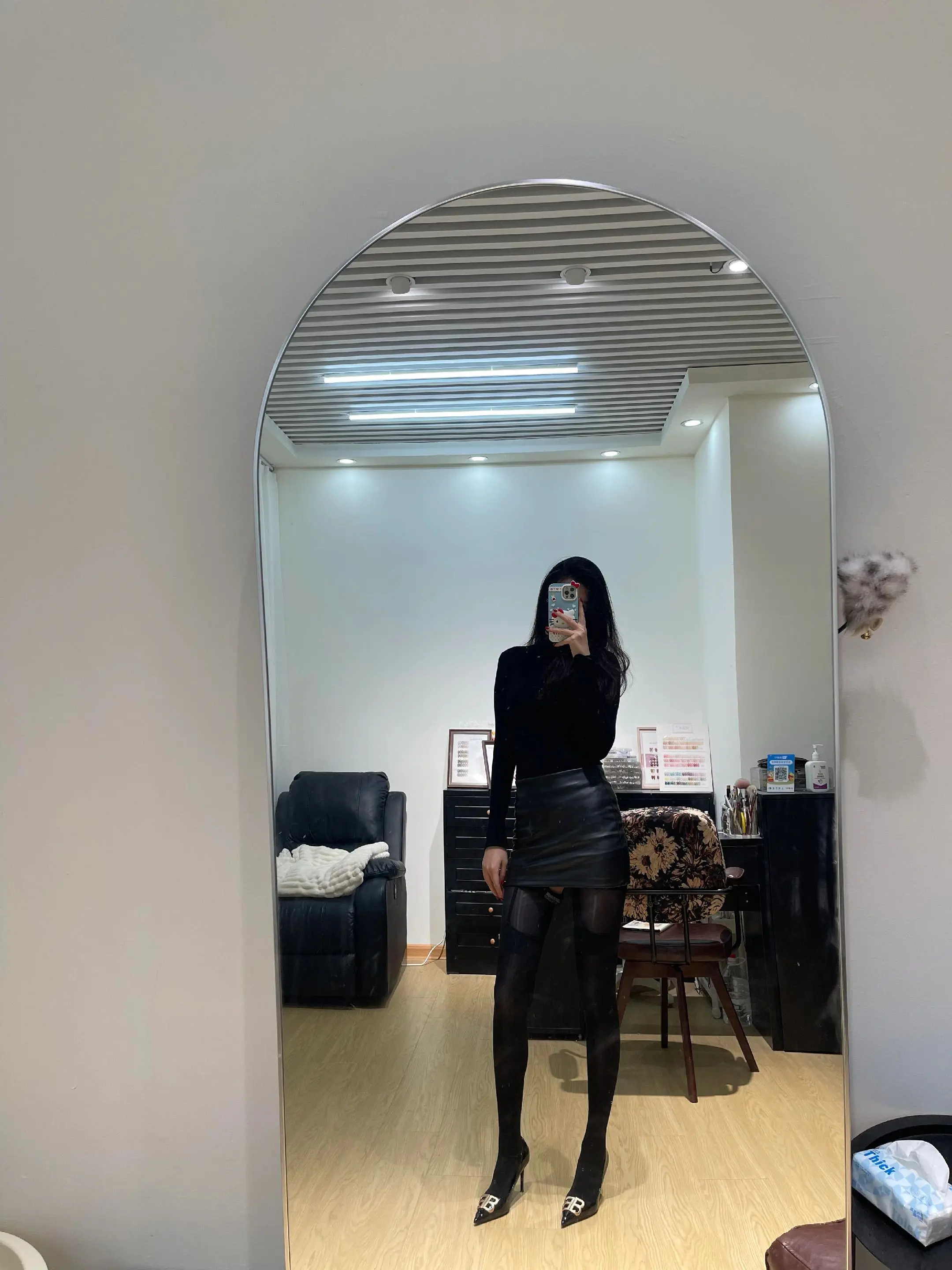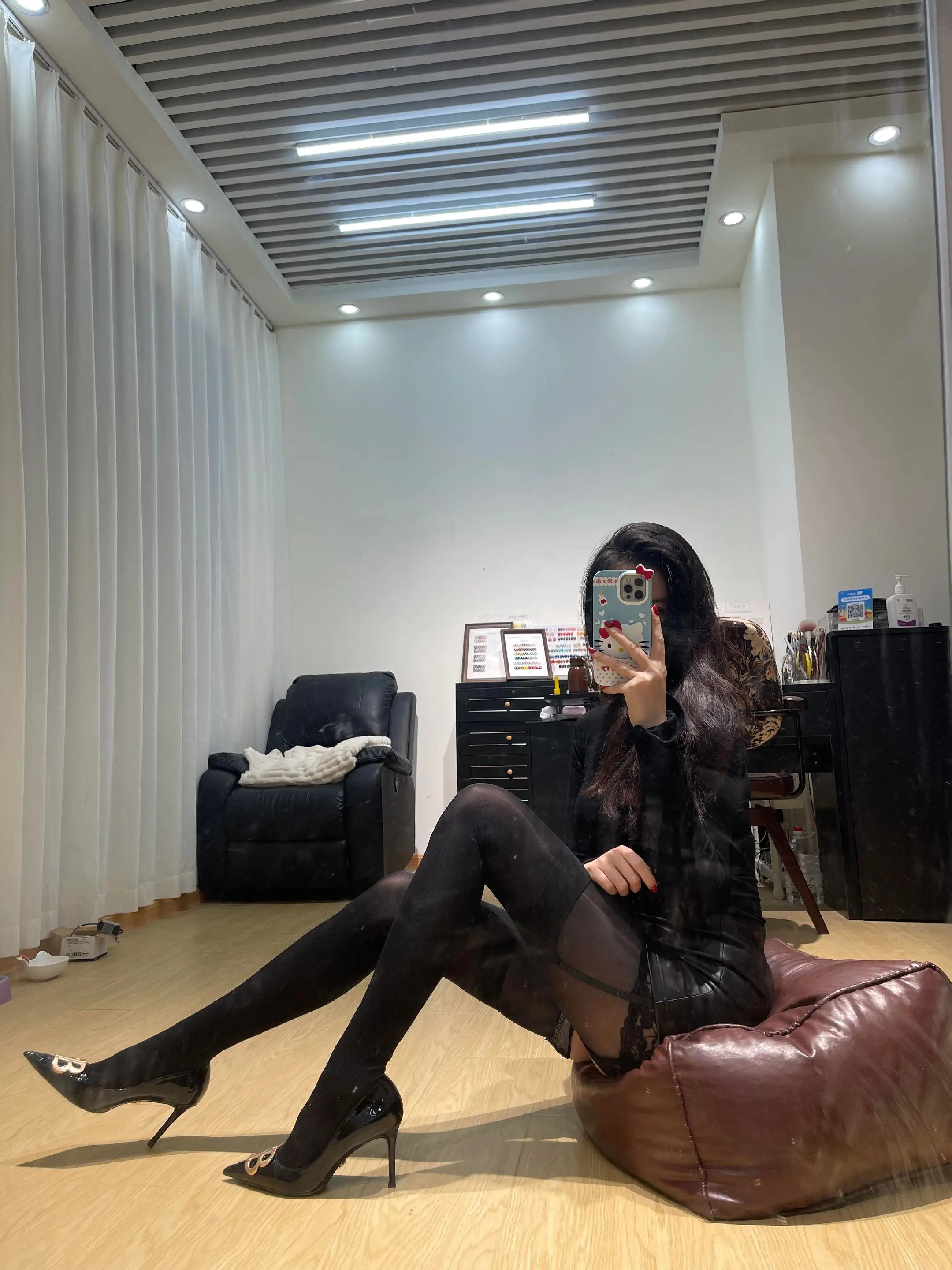 美腿辣妹,黑丝配黑色包臀连衣裙配红底黑高跟配披肩长卷黑发,简直绝了!