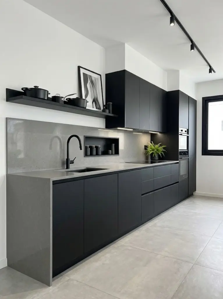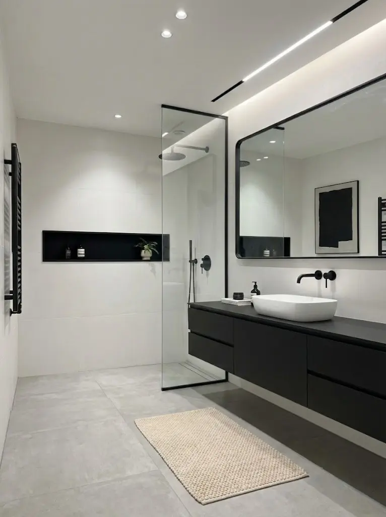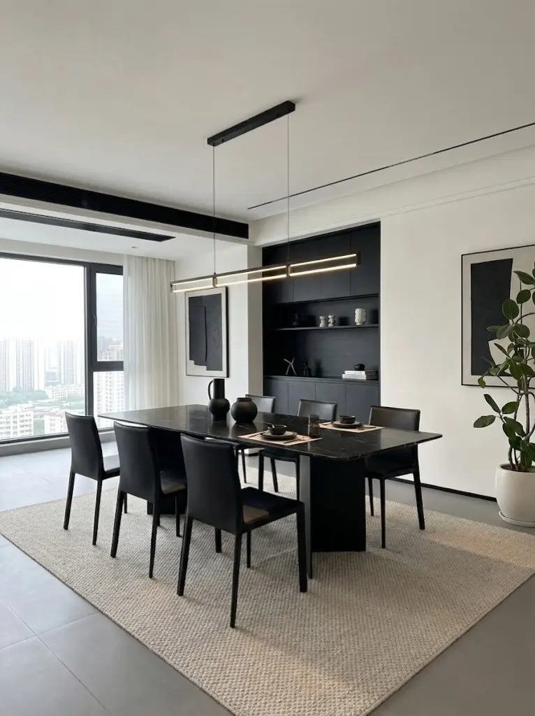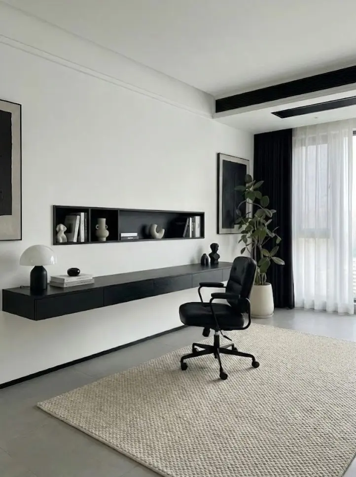 步入公区,视觉的焦点在于极致的黑白对撞。大面积的哑光黑柜体与纯白墙面形成强烈张力,悬浮式设计的电视墙与书桌,巧妙削弱了体块的厚重感,让空间显得轻盈而通透。极窄的磁吸轨道灯与线性吊灯贯穿全屋,利落的线条在视觉上无限拉伸了层高,勾勒出极简主义的秩序感。